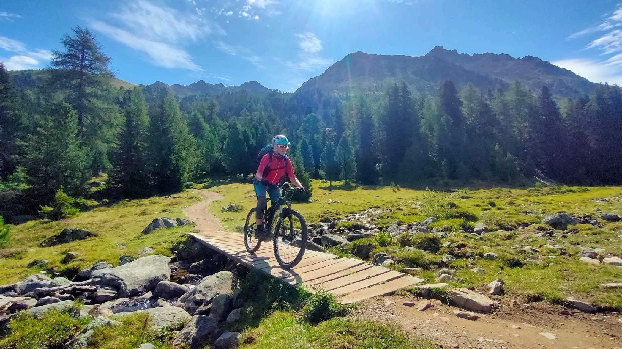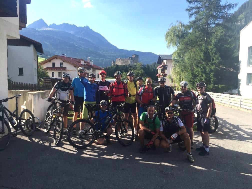 uriger Mittagsrast erreichen wir am Talgrund die Kajetansbrücke. Hier wartet ein weiteres historisches Highlight auf uns. Der Innübergang bei Altfinstermünz war über viele Jahrhunderte eine der wichtigsten Handelsruten Europas. Abenteuerlich durchbricht der wilde Fluss hier eine Engstelle zwischen den Felsen. Der Abstecher lohnt die kurze Schiebepassage danach um den höher gelegenen Innradweg zu erreichen. Wir rauschen wieder zurück in die Schweiz. Das Engadin mit seinen Bergen heißt uns willkommen. Über Schmugglerwege erreichen wir einsamste Bergregionen. Wie haben die Menschen hier wohl vor 100 Jahren gelebt? Tief unter uns liegt das enge Bett des rauschenden Inns. Kaum zu glauben, dass auch wir vor zwei Stunden noch da unten waren. Über eine herrliche Waldabfahrt erreichen wir schließlich unser Tagesziel in Nauders. Wir übernachten im 4-Sterne-Hotel mit Wellness-Landschaft und allem, was das Sportlerherz begehrt. Wieder ist Wäscheservice möglich.
