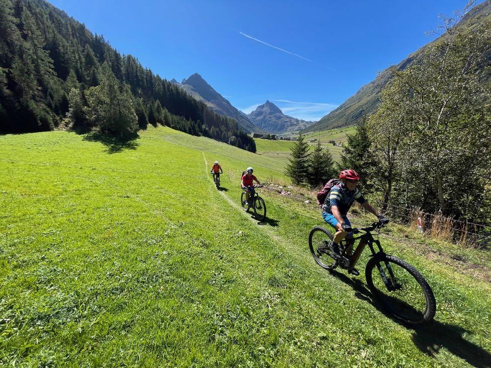 Der Alpenhauptkamm wird heute bezwungen. Wahlweise hilft uns die Seilbahn mehr oder weniger dabei. Mit der Gondel geht es zunächst für alle bergauf bis zur 2300 Meter hoch gelegenen Idalp. Dort ist eine Entscheidung fällig. Entweder gut 400 steile Höhenmeter bergauf durch schönste Bergkulisse, oder ein weiterer Sessellifttransfer bis zum 2700 Meter hoch gelegenen Idjoch. Die Fels- und Geröllandschaft um uns herum ist mehr als beeindruckend, der Blick vom Alpenhauptkamm gigantisch. So schön können die Berge sein. Wie im Rausch vernichten wir dann Höhenmeter um Höhenmeter und passieren dabei gleich mehrfach die Landesgrenzen. Ischgl und das schweizerische Samnaun haben sich seit Jahren den Mountainbikern verschrieben und so gibt es hier eine ganze Reihe von gebauten Trails. Wir nehmen die Trailpassage hinunter zur Alp Trida. meist auch ein willkommener CappuccinoStopp. Dann geht es weiter bergab bis ins Schmugglerdorf Samnaun. Nach
