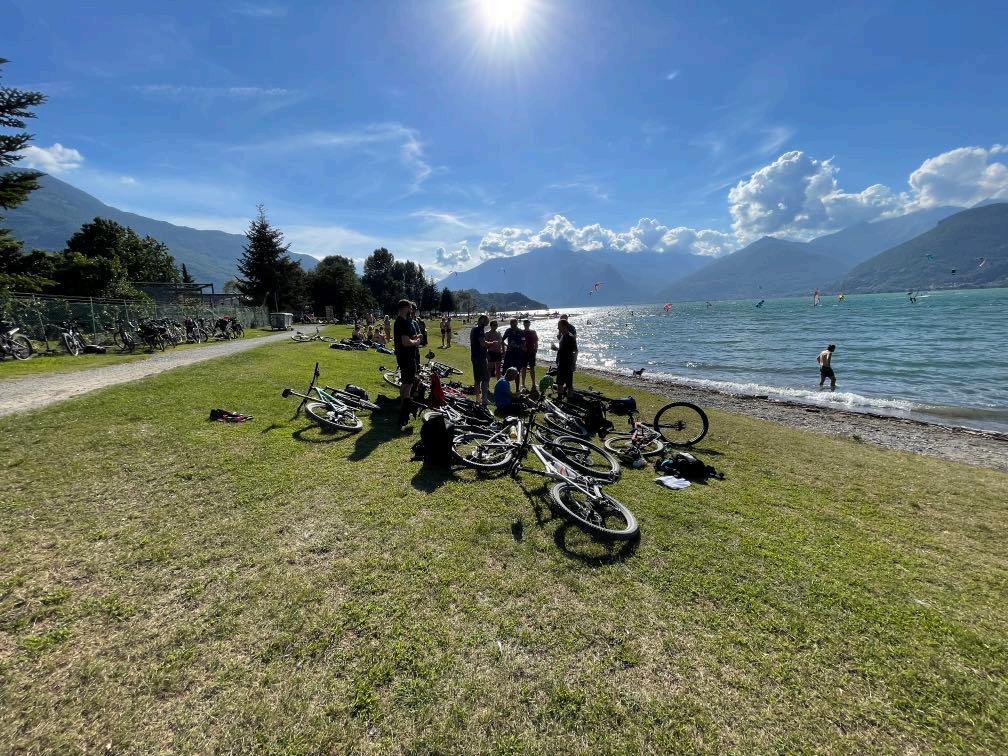 82 Kilometer stehen heute an, doch der Blick aufs Höhenprofil verrät eindeutig: es geht kilometerlang dabei bergab. Trotzdem darf man den letzten Tag nicht auf die leichte Schulter nehmen. Bereits die kurzen aber knackigen Silser Trails treiben den Puls nach oben. Die rauschende Asphalt-Abfahrt vom Maloja Pass mündet in wechselhaften Wegen bis zum Kaffeestopp bei Bregaglia. Ab hier haben die Italiener einen schönen Radweg gebaut, der direkt zu einem Gasthof führt. Die Strecke nach der Mittagspause birgt zwar keine fahrtechnischen Überraschungen, zieht sich aber ob der Kilometer in die Länge. Überwiegend auf Radwegen und guten Schotterstraßen erreichen wir schließlich verkehrsfrei unser Ziel: Den perfekten Badeplatz am Comer See.