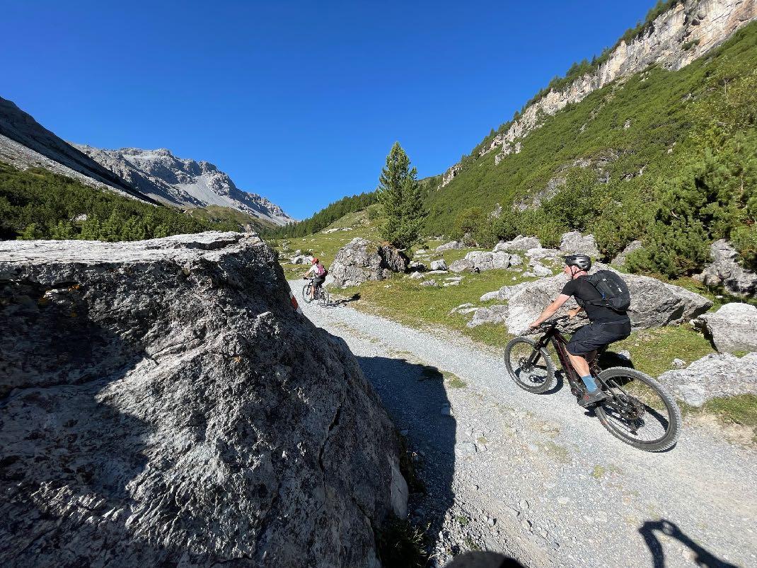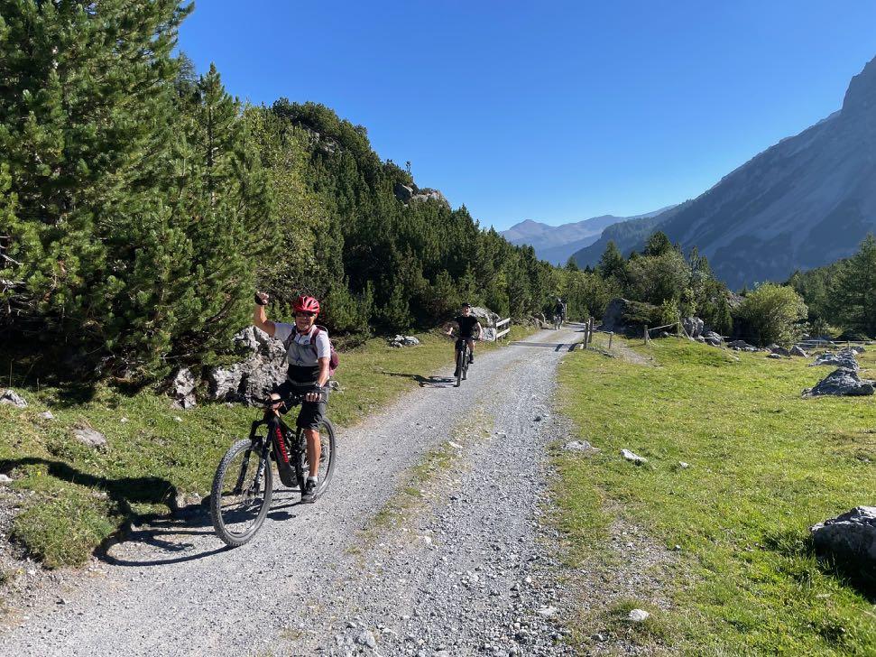 So könnte jeder Morgen beginnen. Ein herrlicher Schotterweg mit moderater Steigung führt uns zunächst ins Verwalltal hinein. Doch der Genuss hat eine Dreiviertel Stunde vor der Mittagspause ein jähes Ende. Gut 20 Minuten schieben stehen an. Eine steile, teils stufige Zwischenpassage muss von allen bewältigt werden. Am Hochplateau entschädigt uns jedoch gleich ein netter Singletrail mit schönstem Panorama. Nach der Mittagspause geht es zunächst auf breiten Schottenwegen teils steil bergab. Der Höhentrail zum Zeinissee ist gut fahrbar und erst zum Schluss sehr steil. Die letzten Kilometer nach Ischgl sind Genuß pur. Wir rollen teils auf Asphalt, teils auf herrlich weichen Waldwegen von oben direkt ins Hotel. Insgesamt ein perfekter Mountainbiketag mit allem, was sich Biker wünschen.