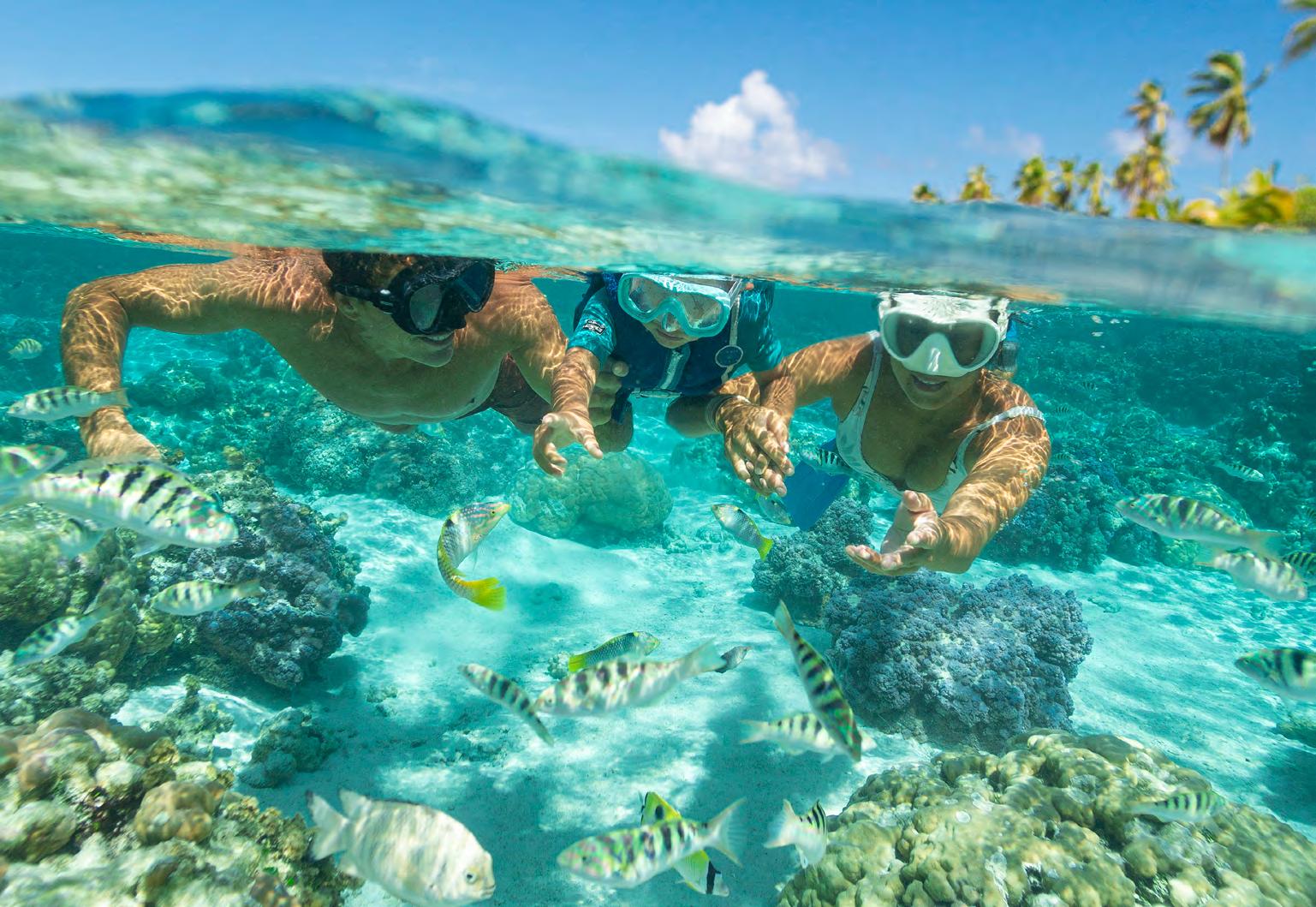 FAMILIES CAN ENGAGE IN A VARIETY OF WATER ACTIVITIES, FROM CHARTERING A BOAT TO SNORKEL AND SWIM AMID VIBRANT MARINE LIFE IN THE LAGOON TO EMBARKING ON THRILLING SHARKAND RAY-FEEDING EXCURSIONS.