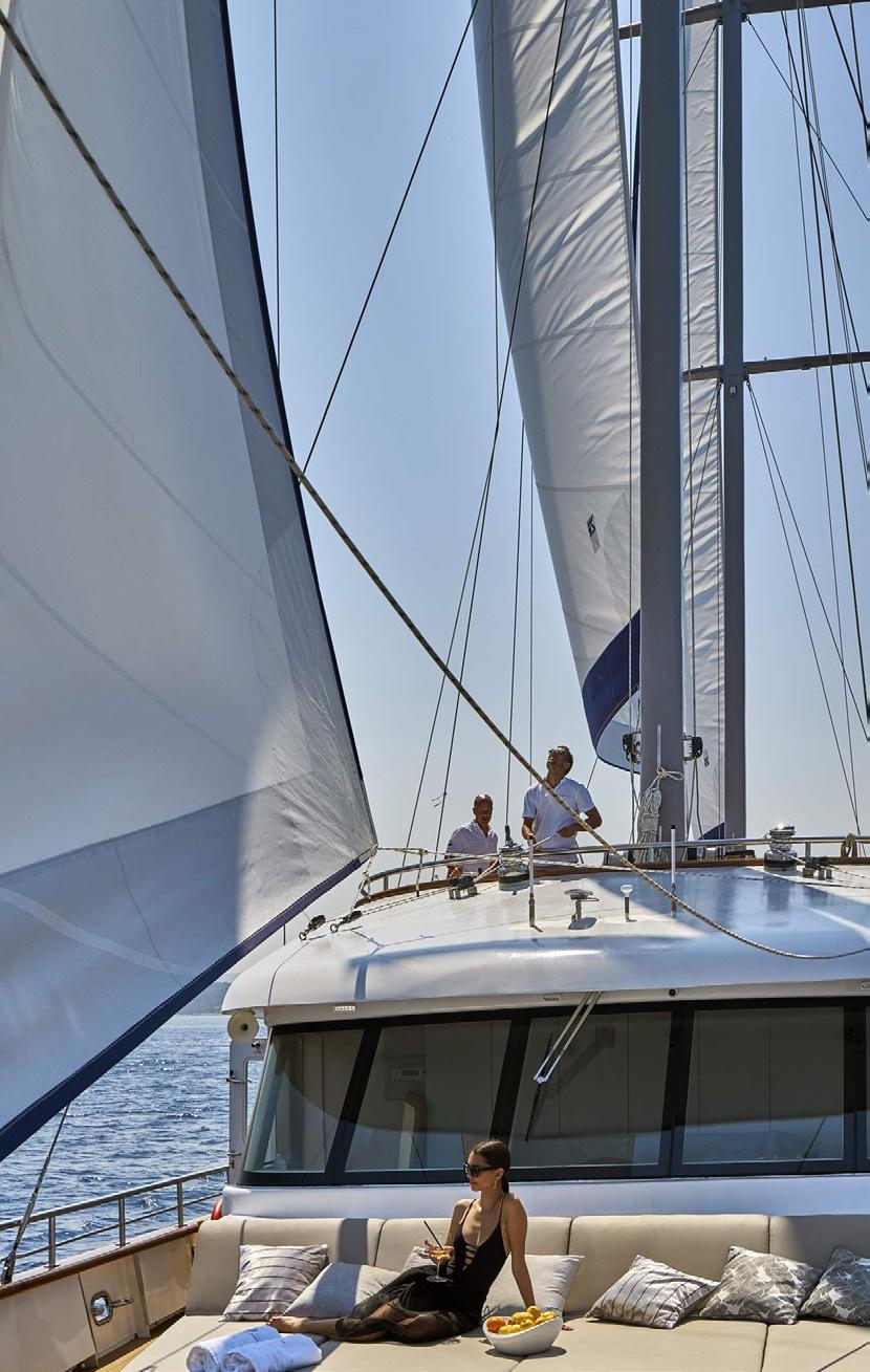 The MS Symphony is the largest yacht on our list, accommodating 34 people in 17 cabins spread across three decks. It’s no surprise that a yacht this large needs a crew of 12 to service it. The Sym phony has been completely rebuilt for the 2023 season with features like a cinema, gym, sauna, and wellness room. There’s also a spacious sundeck, 10-person Jacuzzi, and plenty of water toys to explore the Adriatic with.