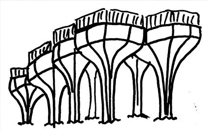 Tijdens de eerste brainstorm sessie leek het een goed idee om paddenstoel achtige tribunes te maken die in kleine of grote getallen bij gebouwd kunnen worden om te voldoen aan het groeiende aantal toeschouwers. Hierbij zal er wel een tribune zijn die uit een groot stuk bestaat in het midden.