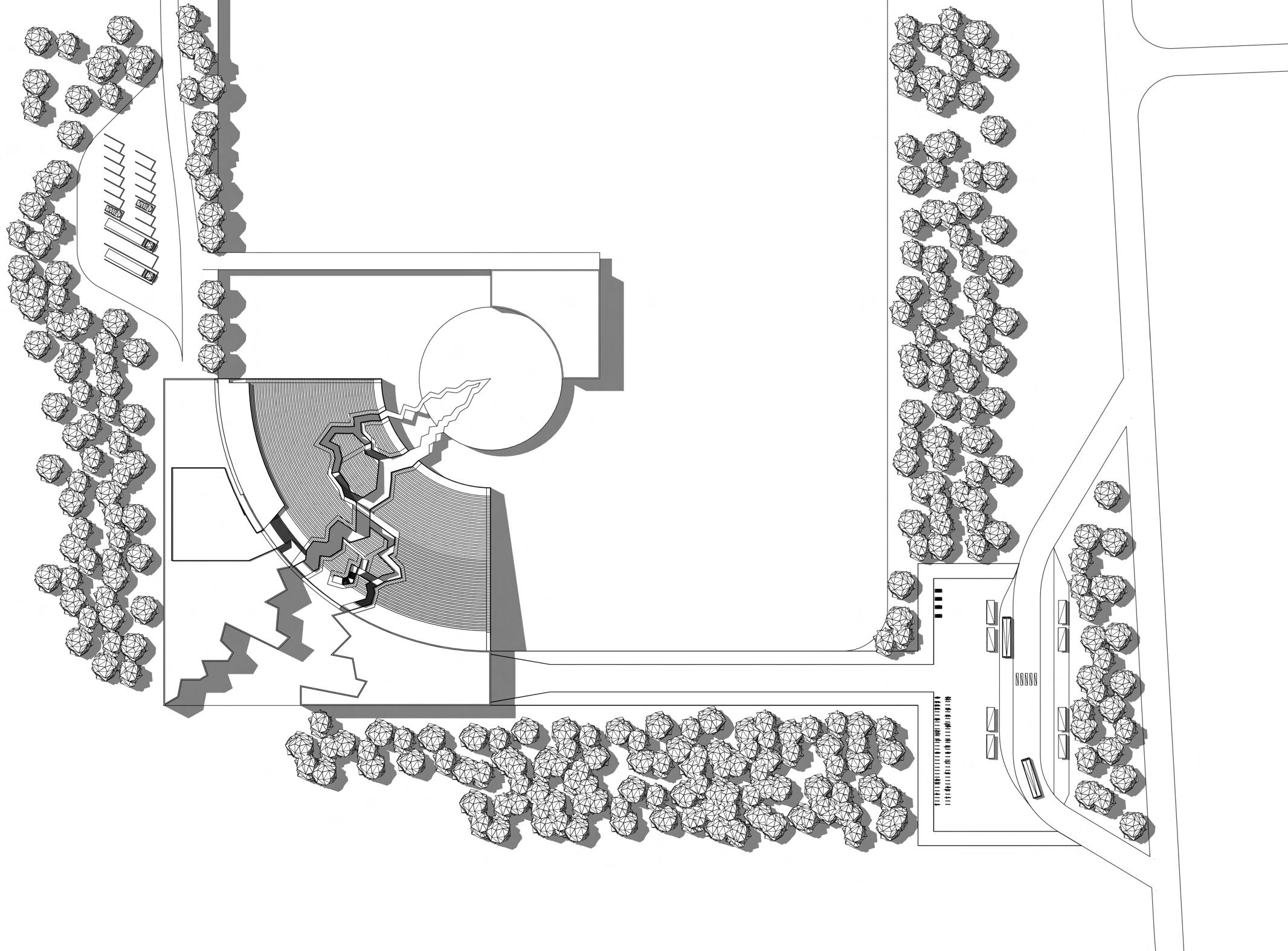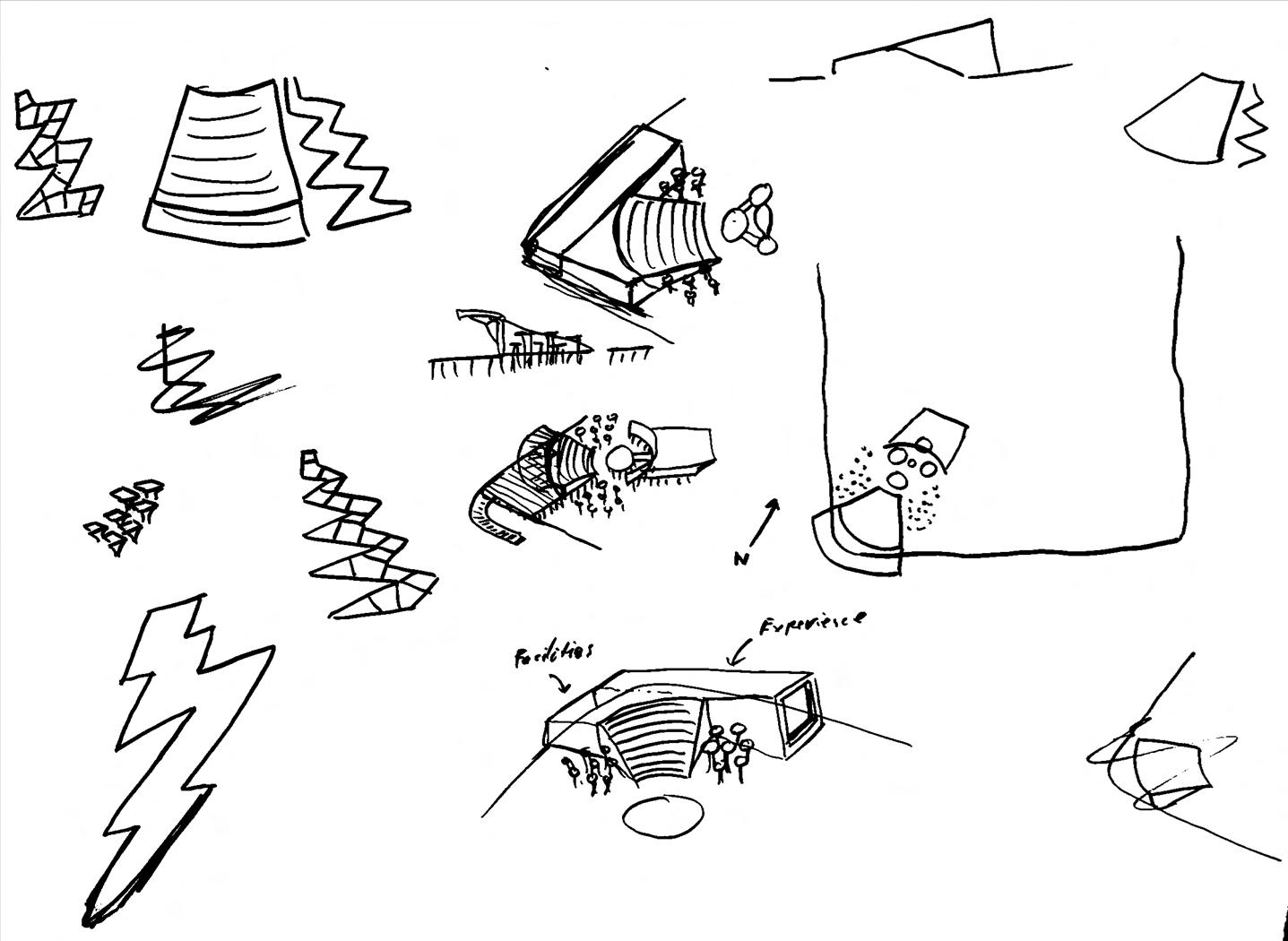In dit concept is een aardbeving thema toegepast namelijk, twee scheuren door de tribune. Deze scheur zorgt voor een brokkelige gefragmenteerde look die de omtrek van de paddenstoel tribunes moeten vormen.