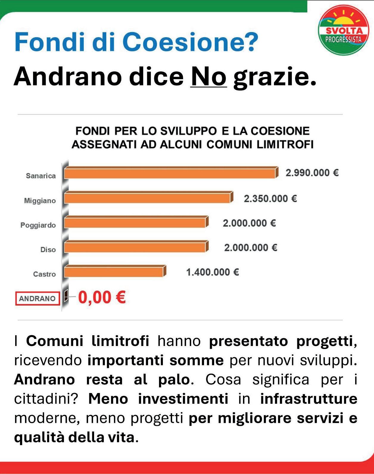 La politica locale sembra non ascoltare più le necessità dei cittadini. Il nostro territorio, seppur ricco di potenzialità nell’entroterra e nell’area costiera, continua a soffrire per l'incuria, la scarsa manutenzione e l'inutilizzo di risorse che potrebbero contribuire a un cambiamento positivo. La bellezza e la funzionalità delle nostre comunità di “Andrano, Castiglione e la