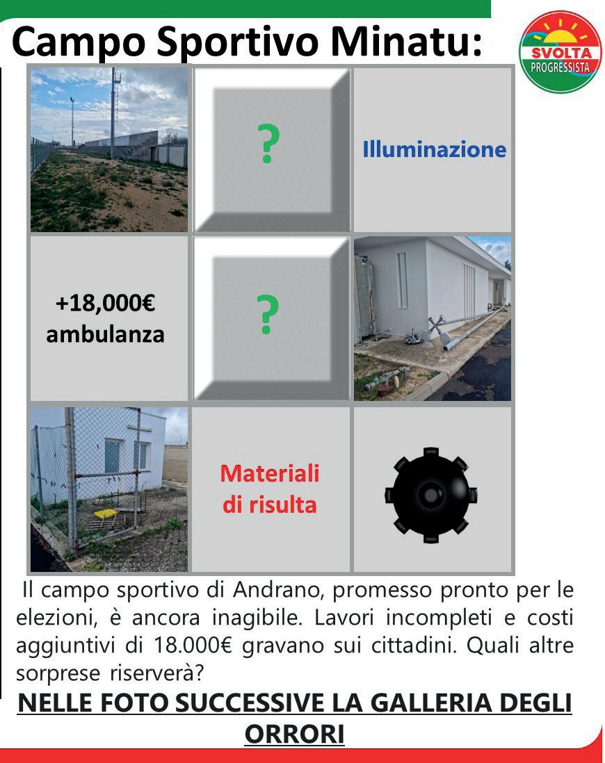 iniziando dal Personale. Nell’area tecnica del nostro Comune sono presenti in pianta organica molte unità di livello D: storicamente il Comune di Andrano non ne ha mai avute tante. Nessun Comune di pari categoria vanta una task force di simile portata Allora che senso ha rivolgersi a dipendenti di altri comuni come l’Ing. Toma (Ugento)? Tra competenze e rimborsi spese (carburante per la macchina dal comune di residenza al nostro…AVETE LETTO BENE) sopportiamo una spesa di circa 20.000 euro annui. Con quali risultati? Giusto per citare 2 esempi: - Muraglione “Belvedere” della zona Botte costato 600.000€, ben 100.000€ in più di quanto stanziato. - Campo Sportivo costato 850.000€ è in stato di totale abbandono con fari non sostituiti, lavori non terminati, migliorie di gara non eseguite e chissà cos’altro.