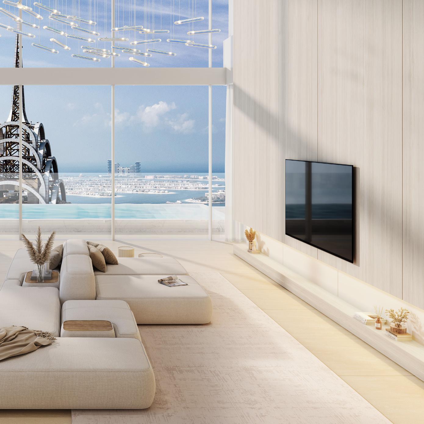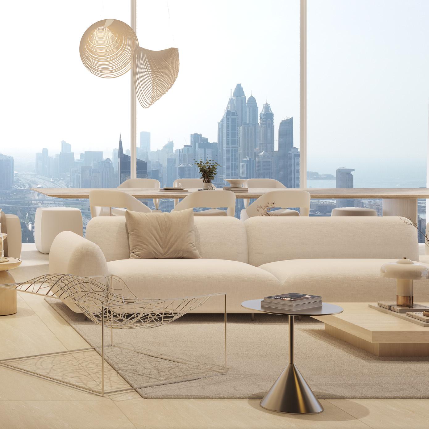 Open-plan living and dining spaces are framed by 3.2-meter floor-to-ceiling windows. Expansive sky gardens extend 5 meters towards the horizon, offering unparalleled views of Dubai’s iconic skyline for tranquil moments above the city’s heartbeat.