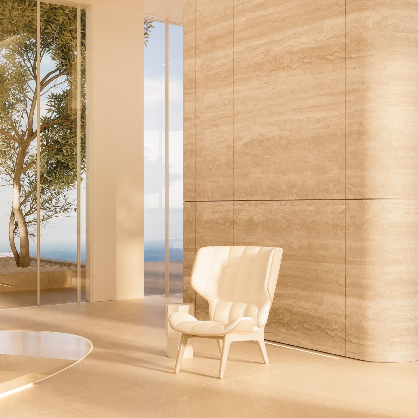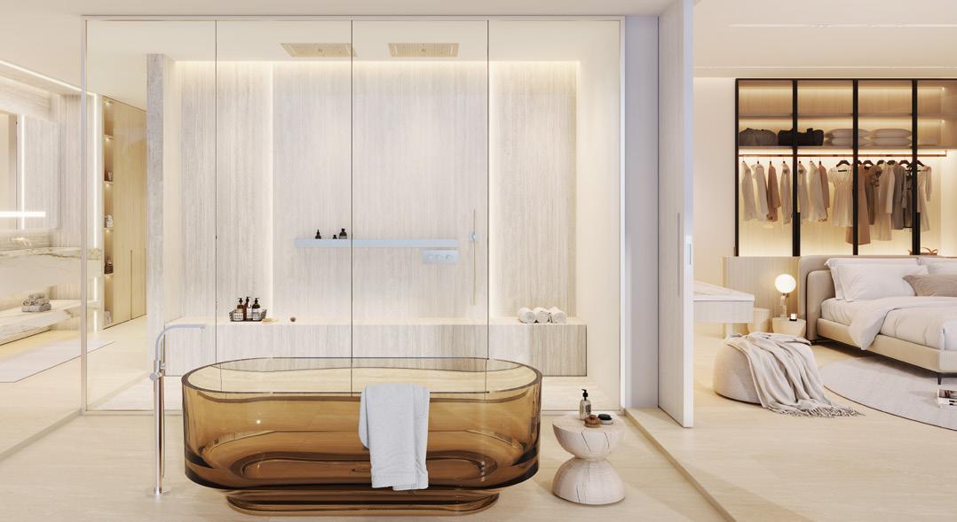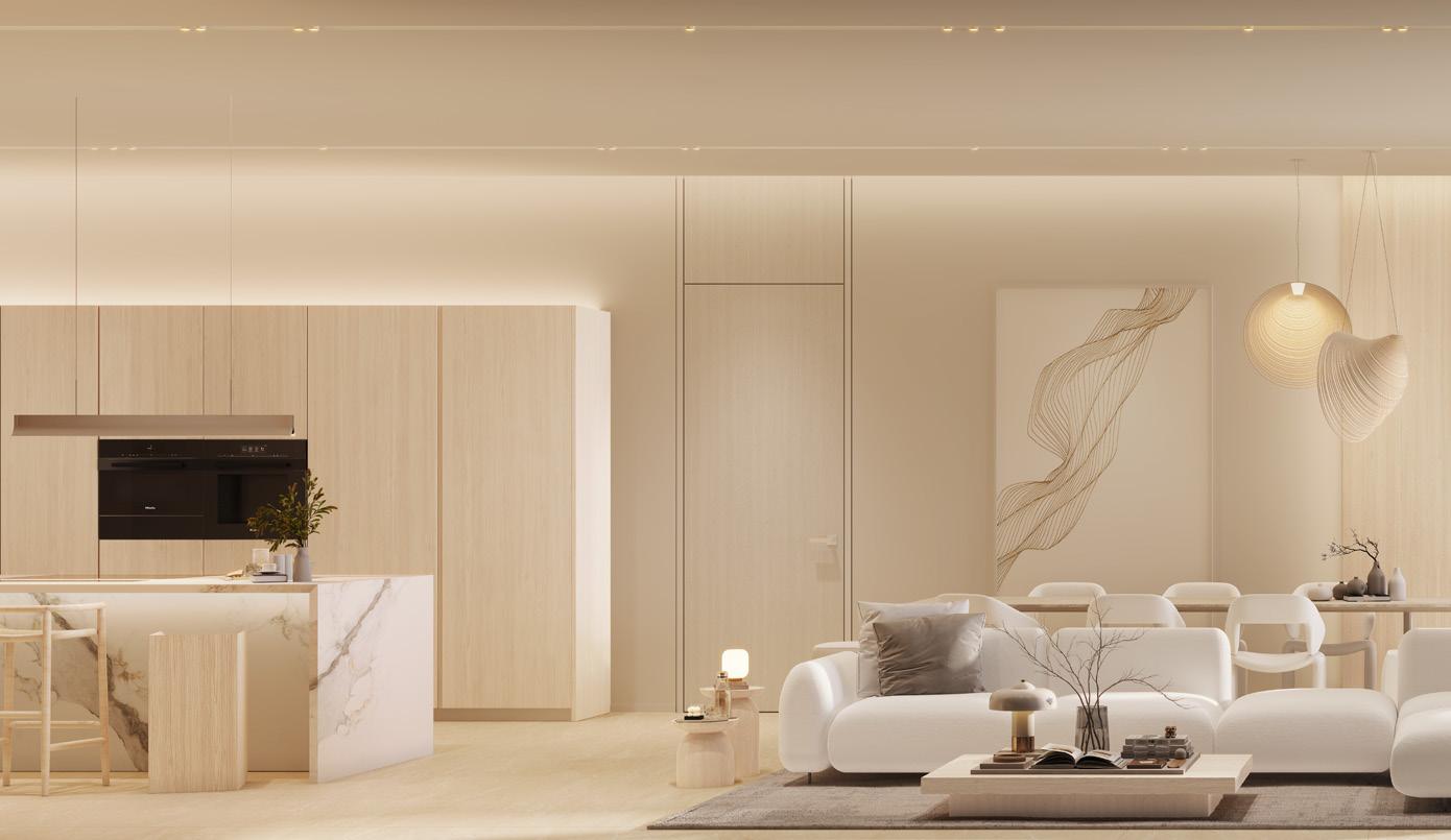 Luxury interiors are thoughtfully curated, featuring social kitchens by pioneering Italian designer Pedini, exquisite Miele appliances, and elegant travertine floors and countertops. Bathrooms are equipped with smart mirrors and top-of-the-range Kohler and Hansgrohe fixtures, creating a spa-inspired retreat at home.