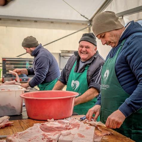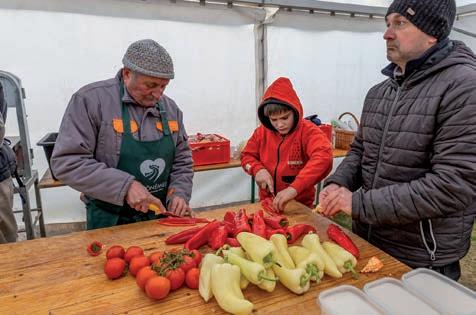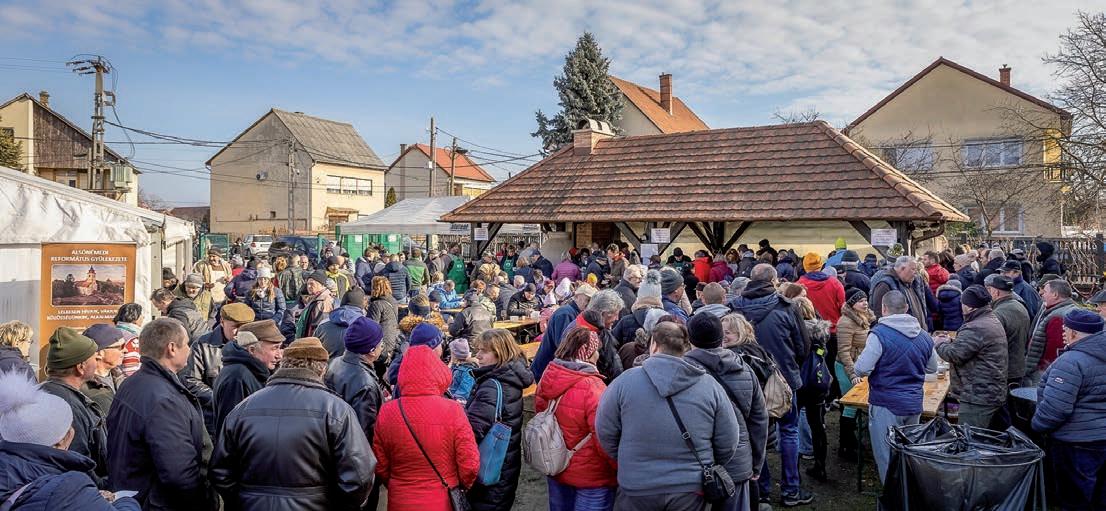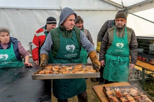szorgos munka folyt. Három disznót vágtunk, melyet Barizs Tamás, Ladányi Béla, Lovas József és Szarka Zoltán ajánlott fel a község számára, további természetbeni felajánlással id. Fejes József, Kiss Béla, pénzadománnyal Surányi Rezső és ifj. Marosi Boldizsár támogatta rendezvényünket, a Református Egyház finom Kálvin-tallérral, Bálint Dániel egy nagy tálca cukrászsüteménnyel, a Polgármesteri Hivatal dolgozói rengeteg kókuszgolyóval, falunk