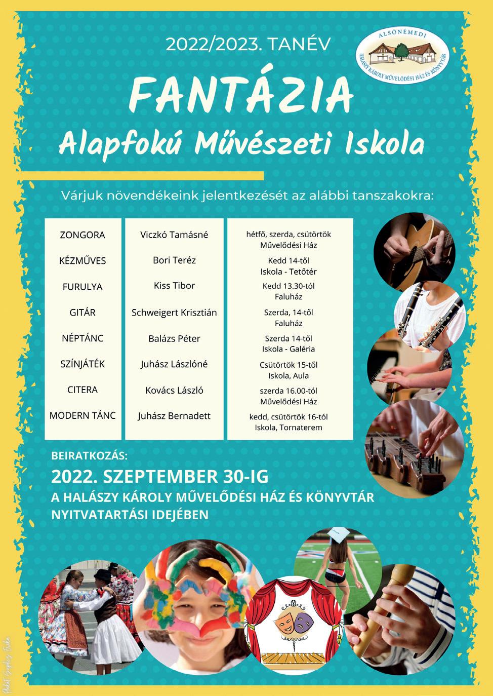 Török Lajosné Nagyné Ligetfalvi MagdolnaEbben az évben is a Halászy Károly Művelődési Ház és Könyvtár munkatársai szervezték az évről évre megrendezett Gézengúz tábort. Minden évben sokan jelentkeznek, de 2022-ben ez már 120 kis gyermeknek okozott 4 héten keresztül remélhetőleg maradandó élményt. Minden nap színes és egyedi programok várták a gyerekeket. Belekóstolhattak a néptánc, a hip-hop, a jóga világába, amit ezúton is köszönünk a szakembereknek, Ladányiné Mó nikának, Majorné Marosi Briginek, Balázs Péter nek, sok gyermek ettől kapott kedvet, hogy esetleg szeptembertől iskolai időn kívül is járjanak ezekre a foglalkozásokra. Rengeteg szép kézműves aján dékot készíthettünk a művelődési ház dolgozóival, gyönyörű álomfogókat, poháralátéteket és karkötőket vihettek haza emlékbe a táborozók. Nagy élményt jelentett, hogy idén két ló is érkezett a Faluház udvarára, amit Supliczné Raminak kö szönünk, érdekes előadást tartott a lovak tartásáról, gondozásáról, mindenki kipróbálhatta a lovaglást is. Kutyaterápiás foglalkozásban is részt vettek a gyerekek. Mindig nagy örömet okoz, ha valaki se