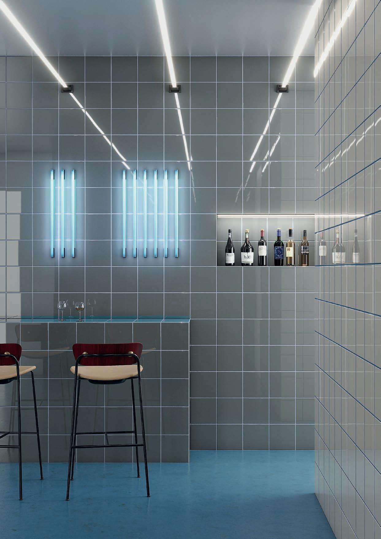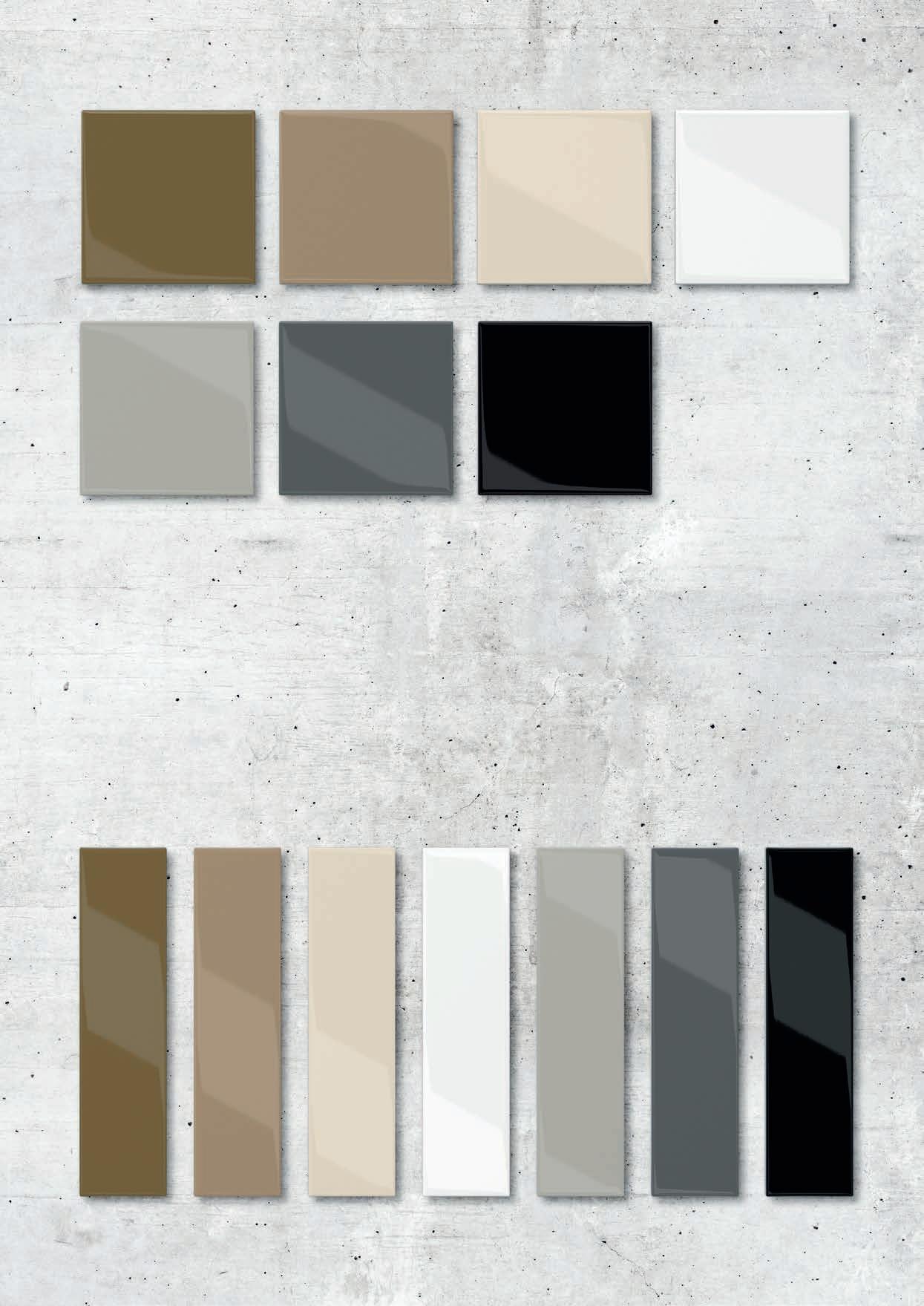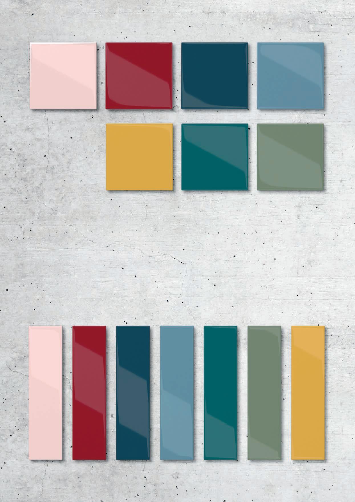 Collezione di piastrelle da rivestimento d’interni, realizzata in monoporosa in pasta bianca, composta da quattordici colori lucidi suddivisi in due categorie – colori di accento e colori neutri –declinata nei formati – 20x20 cm e 10x40 cm, spessore 8 mm.