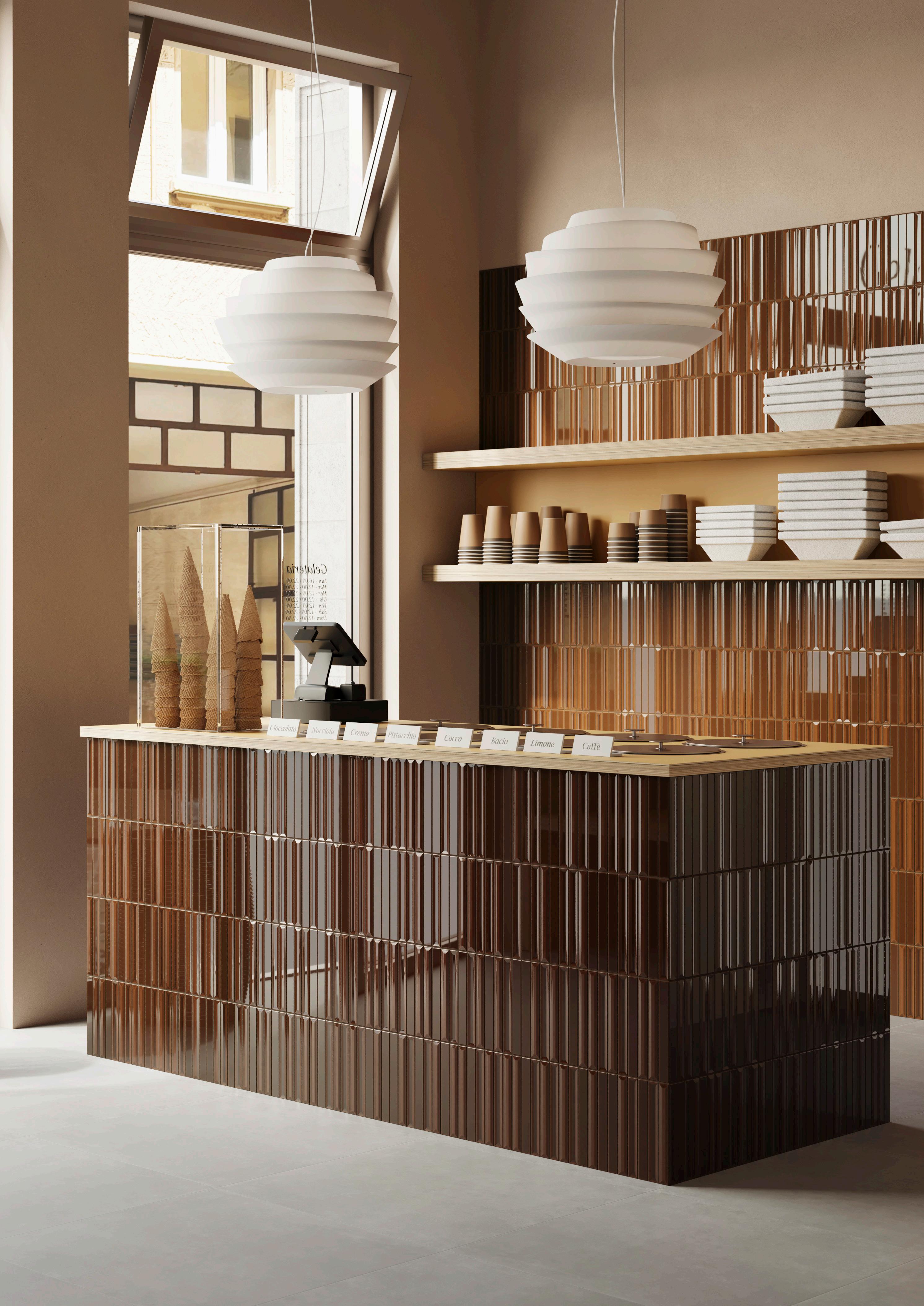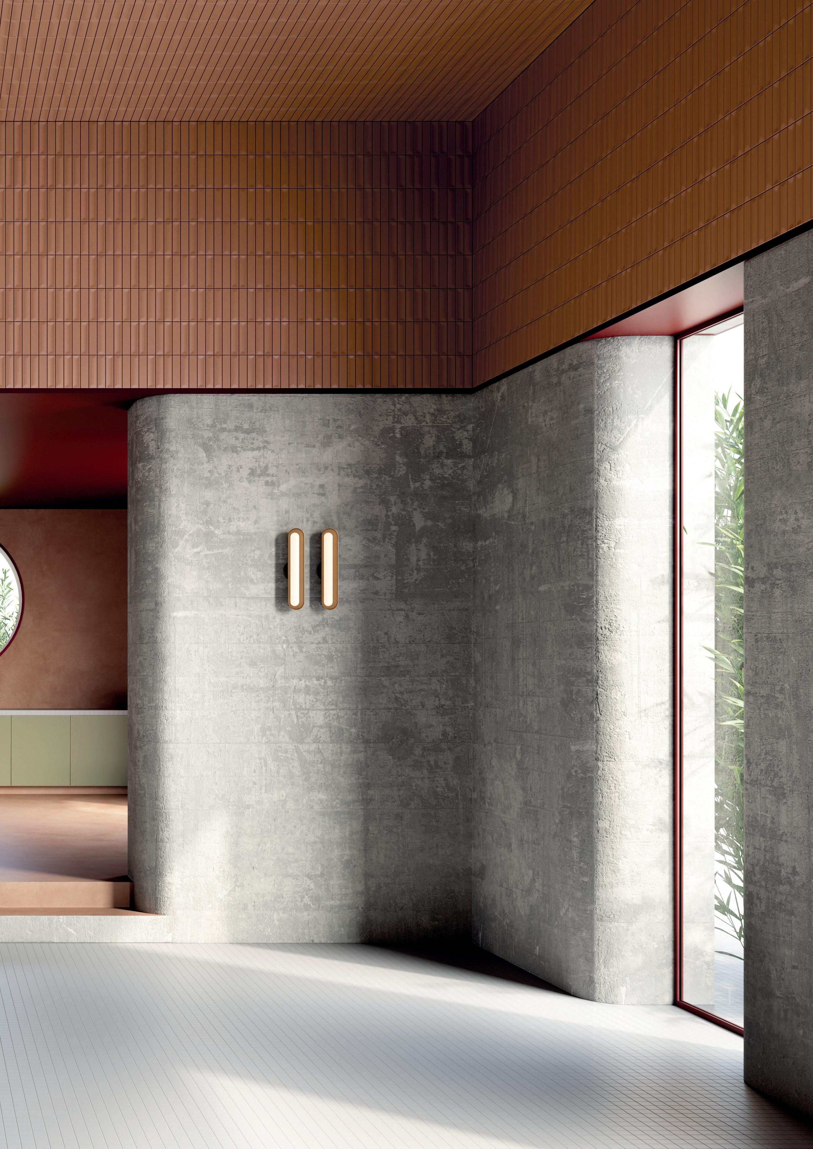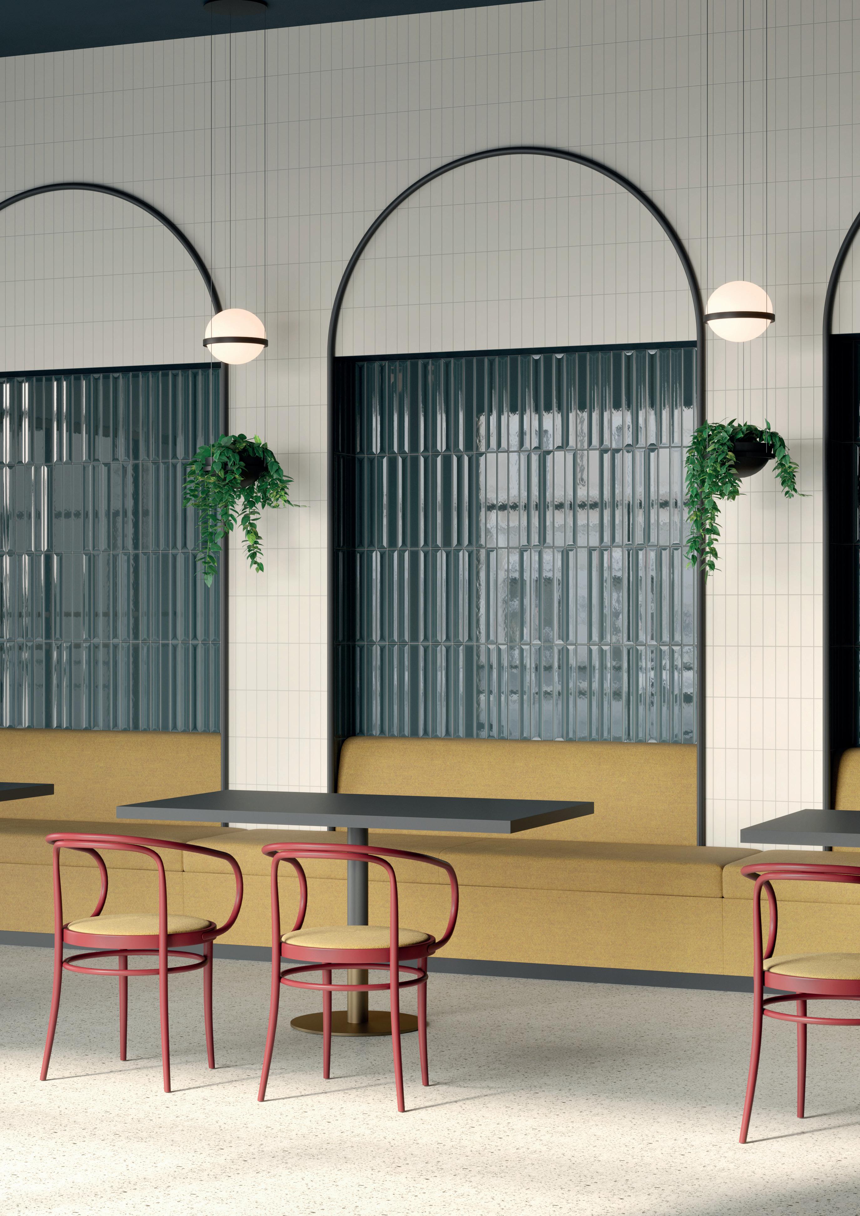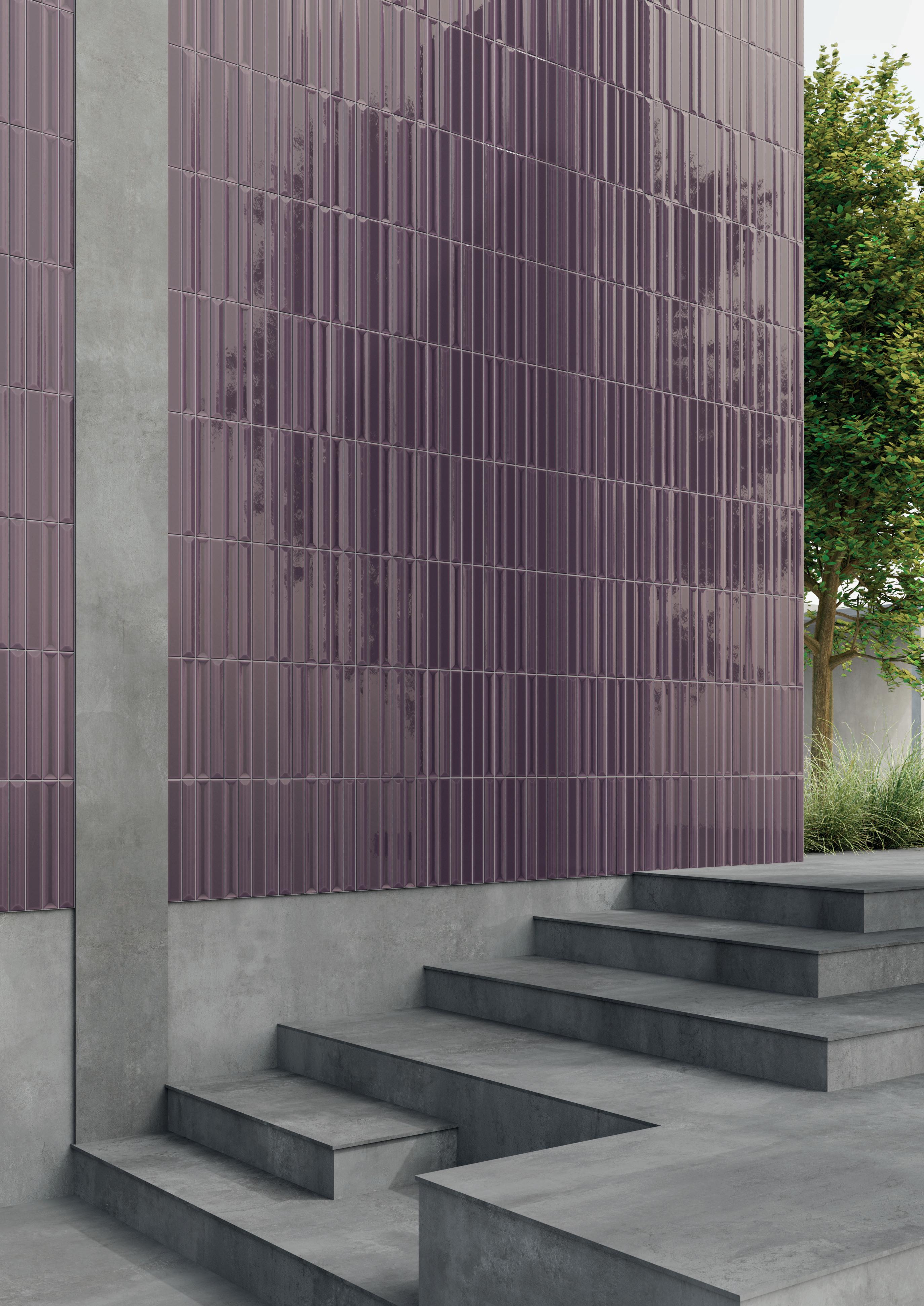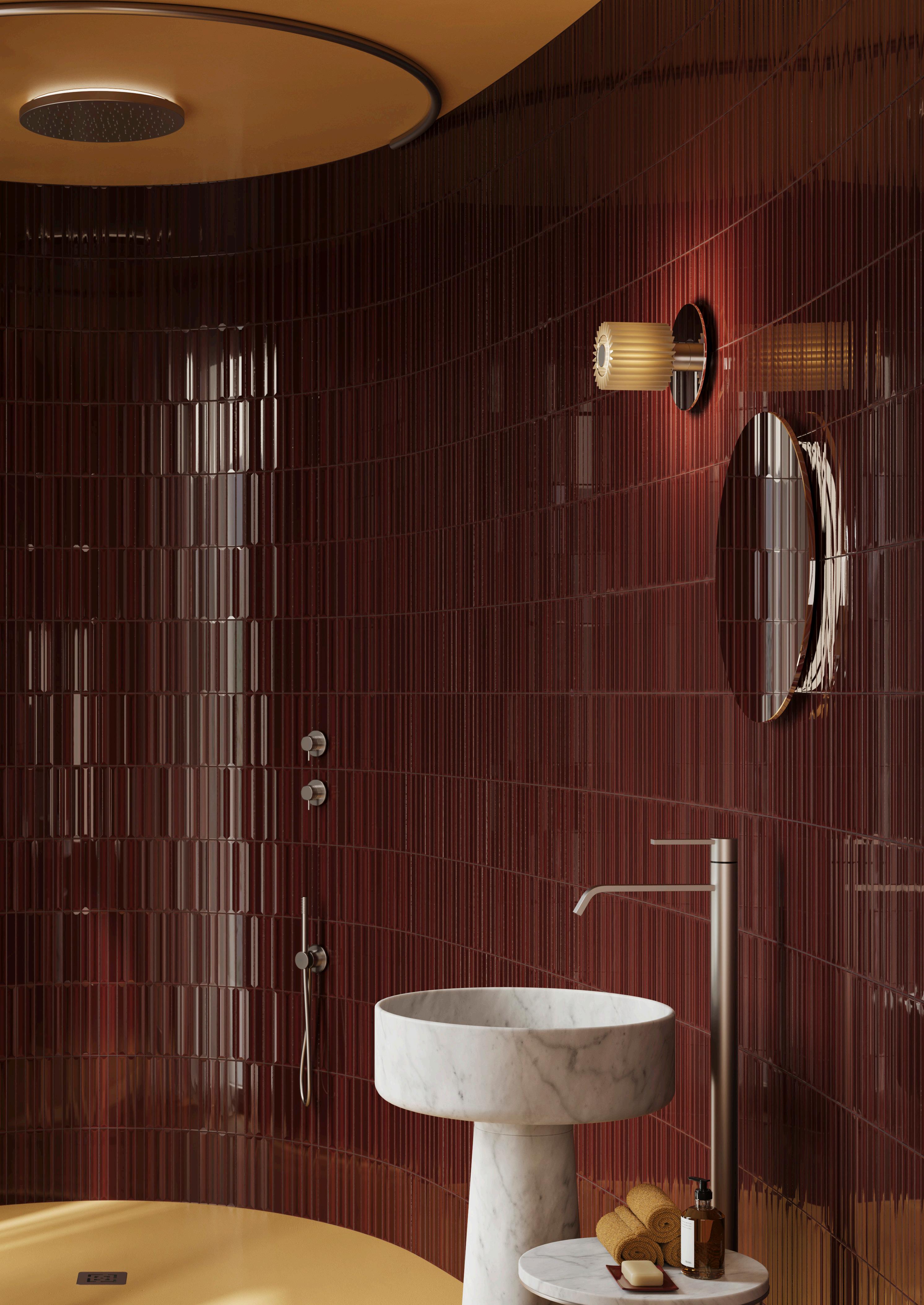 Thecollectionincludesconcave,convexandflatstripsin5x20cmand5x40cmsizes,mountedinmixedcompositionson a30x40cmmesh.Itisavailableinawiderangeofcolorsandfinishes,makingitsuitablefordifferentdesigncontexts— from residential and commercial interiors to façade cladding—in continuity with a typically Italian architectural tradition. Customized solutions also allow the creation of bespoke laying patterns and personalized color mixes.