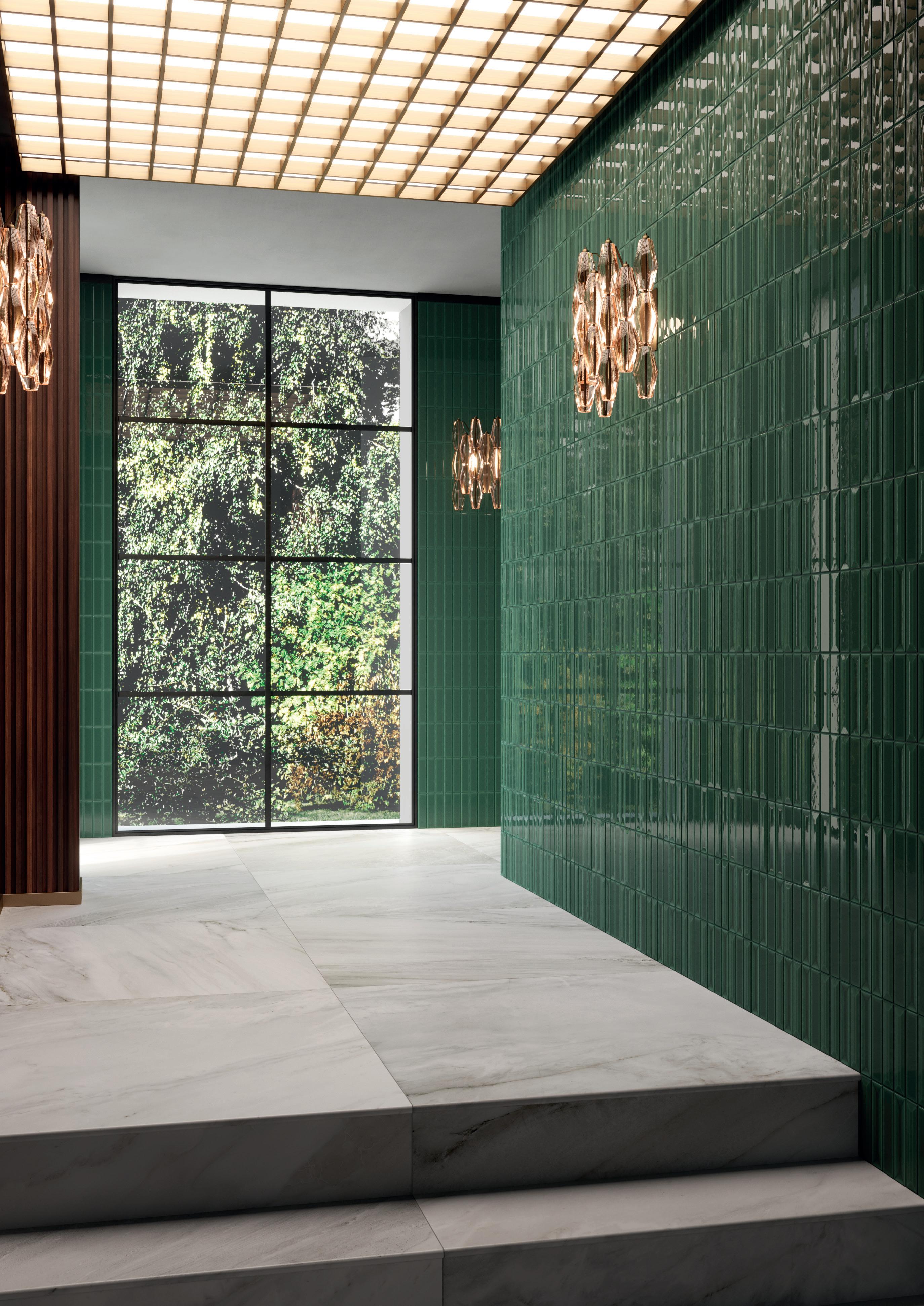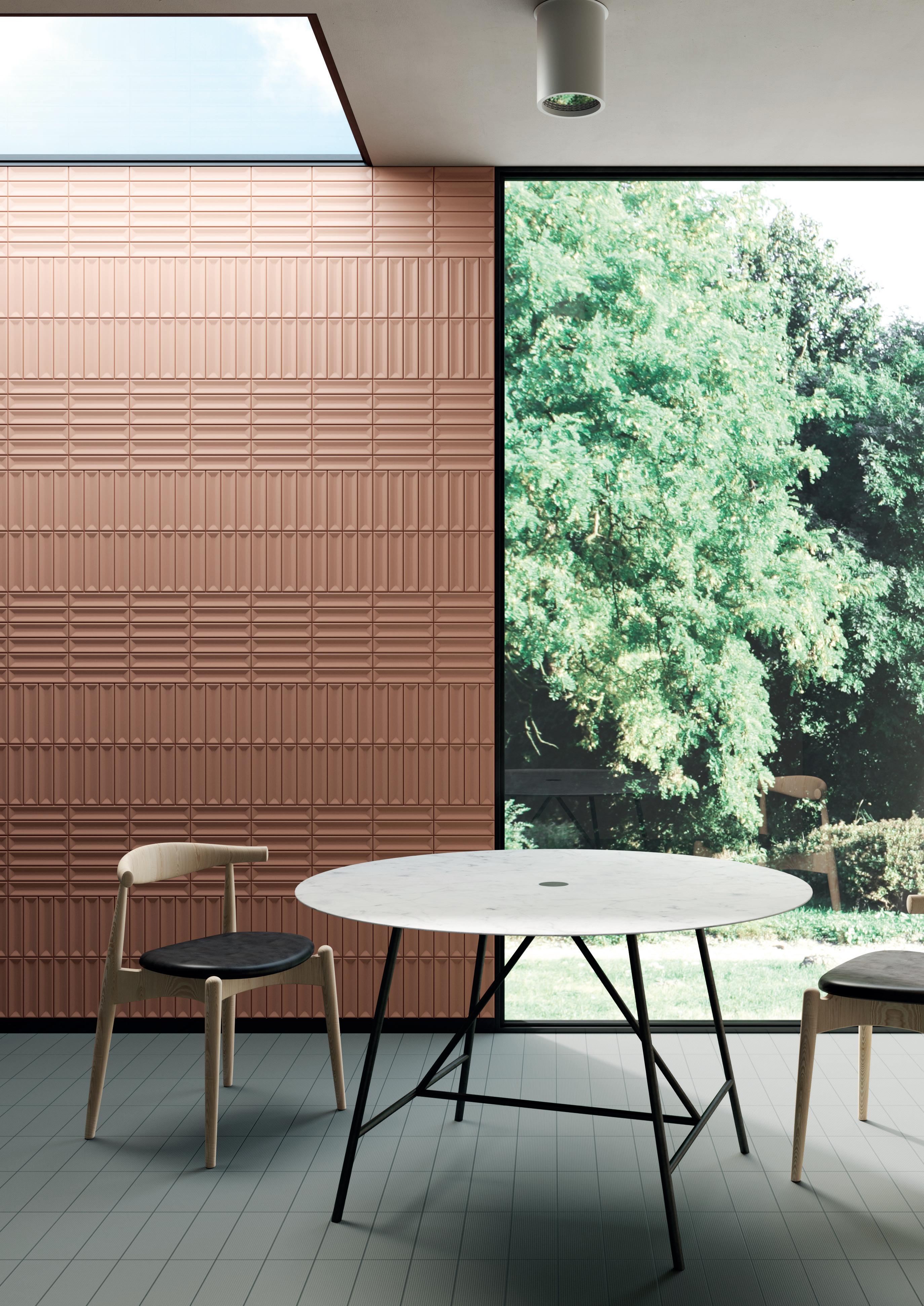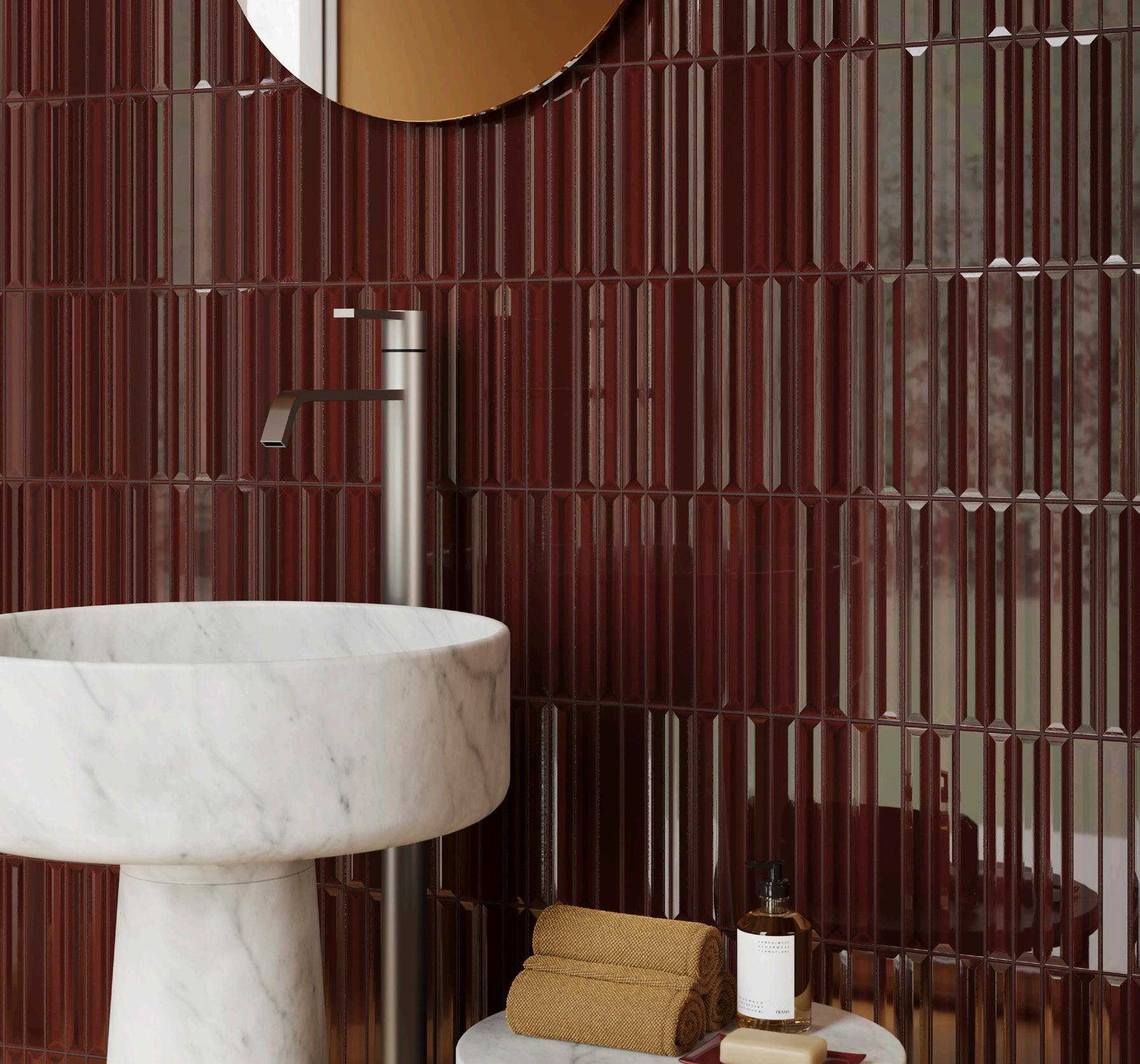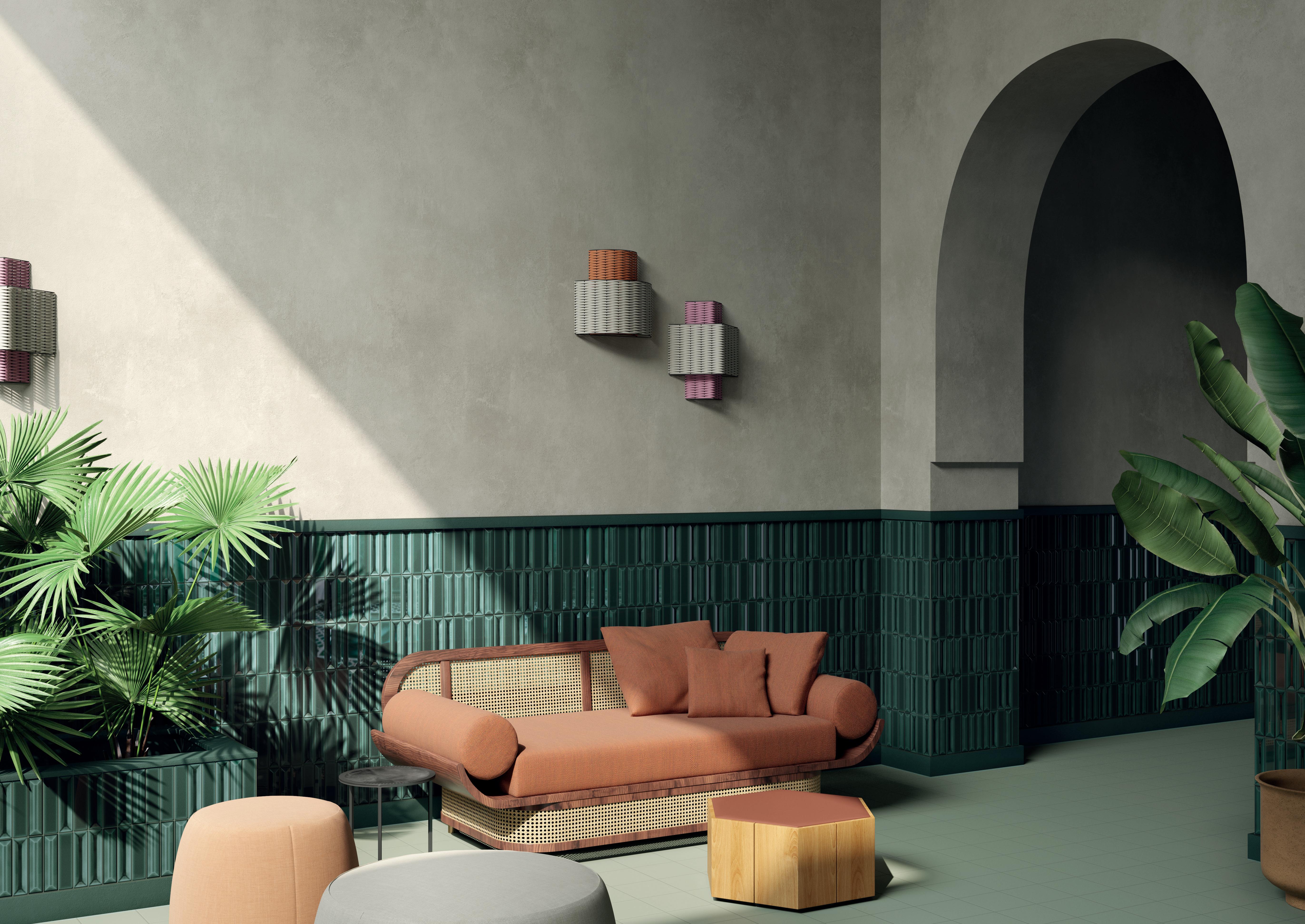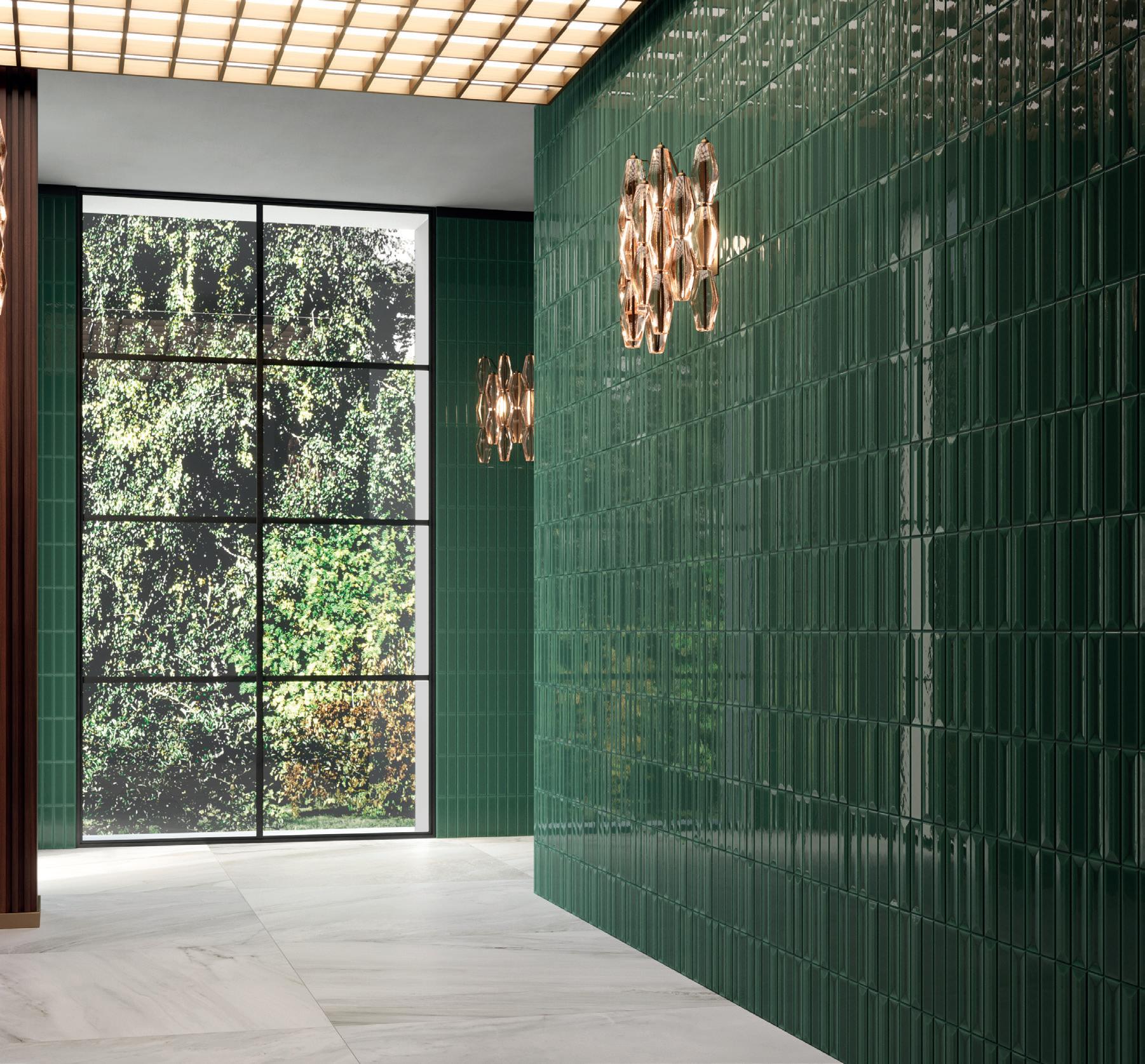 Thecollectionincludesconcave,convexandflatstripsin5x20cmand5x40cmsizes,mountedinmixedcompositionson a30x40cmmesh.Itisavailableinawiderangeofcolorsandfinishes,makingitsuitablefordifferentdesigncontexts— from residential and commercial interiors to façade cladding—in continuity with a typically Italian architectural tradition. Customized solutions also allow the creation of bespoke laying patterns and personalized color mixes.