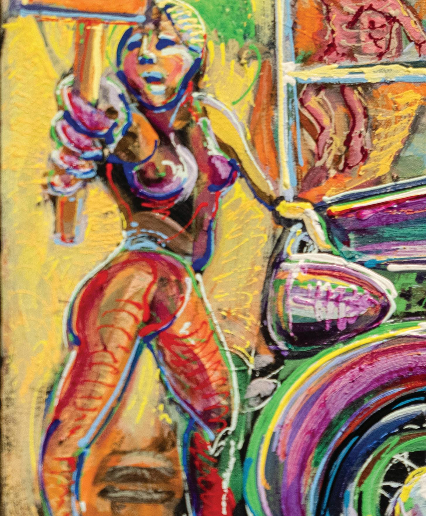 El título de la exposición, In Your Face , no solo es una referencia literal al acrónimo CARA (cara en español), sino un reconocimiento de que el arte chicano es tan audaz, provocativo y ambicioso como antes. Los artistas chicanos siguen siendo políticos, siguen preocupados por las libertades civiles y la justicia social, y aún hay visiones feministas sólidas, imágenes urbanas e íconos culturales. También podemos decir con absoluta certeza hoy que el arte chicano ha redefinido el arte estadounidense y continua haciéndolo. Entonces, ¿ha cambiado algo? Numerosas obras de la exhibición deliberadamente recuerdan el pasado desde el presente. En 2021, Patssi Valdez tomó una fotografía de aproximadamente 1986 de ella misma y del artista Harry Gamboa Jr. y agregó papel cortado pintado, malla, y un nuevo marco para reinventar a los dos artistas que miraban con timidez a través de cortinas de Ventana como Rouge; Dado cargado El mural colectivo del 20.º Aniversario de Los Four (1994) recuerda la exposición de 1974 del colectivo de arte chicano Los Four en el Museo de Arte del Condado de Los Ángeles (la primera exposición de arte chicano en un museo principal), que también incluyó un “mural cooperativo.” Sin embargo, en 1994 solo quedaban tres artistas, ya que Carlos Almaraz había muerto en 1989. Clavo y Alice de John Valadez comenzaron como fotografías, tomadas por el artista