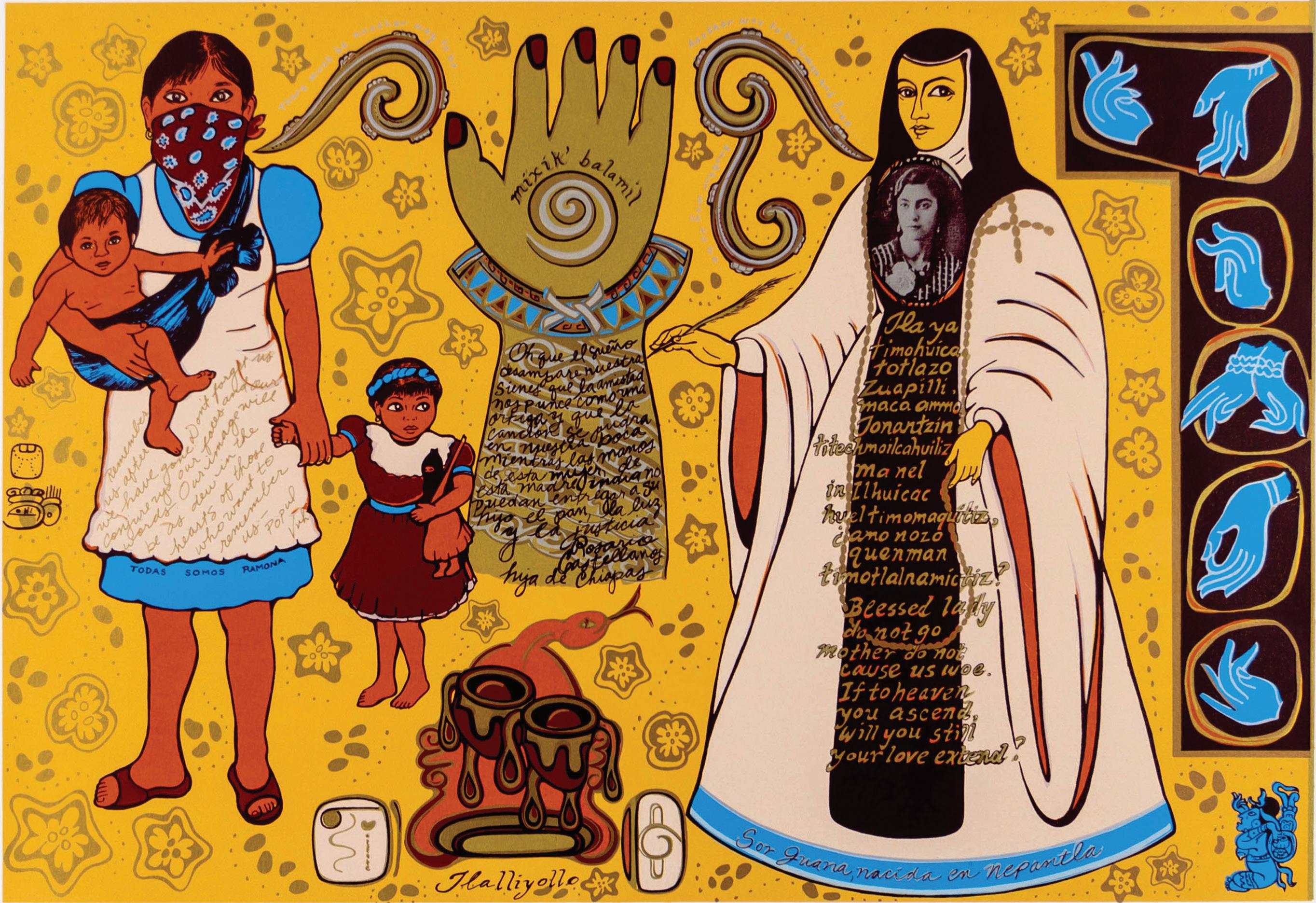 alrededor de 1978 como parte de su serie Portafolio de retratos urbanos del Este de Los Ángeles , y luego se reunieron e imprimieron como serigrafías en 2014. La icónica obra de Ester Hernández Sun Mad (Sol enojada) (1982) fue un ataque mordaz a los pesticidas que envenenaron a los trabajadores agrícolas en la industria de la uva de California. En 2008, Hernández reelabora esta misma imagen para leer Sun Raid (Ataque al sol) , como una crítica sobre la deportación de trabajadores agrícolas indígenas. Otras declaraciones políticas son más sutiles, como la escultura de Linda Vallejo La Victoria (2014) de su serie Hacerlos todos mexicanos que hace que incluso la famosa escultura griega antigua Nike de Samotracia sea marrón oscuro (y, en consecuencia, mexicana). El fotógrafo Harry Gamboa Jr, cofundador del grupo de arte chicano vanguardista Asco (1972–1987), aborda el problema constante de los estereotipos en su serie Hombre chicano sin ataduras (1991–en curso), que se muestra en la exhibición con cuatro fotografías en blanco y negro de hombres chicanos orgullosos (quizás desafiantes) que van desde un músico hasta un estudiante, un artista, y un estimado erudito. Hay obras que hacen referencia a la espiritualidad universal en los tres pasteles de Juanishi Orozco desde 1990, en el majestuoso Volador de Salvador Vega (1993) y en Fluyendo con el ritmo de la tierra de David Botello (1991) y Sin título (1992), que colocan a una mujer indígena cara a cara con un águila en vuelo. Las mujeres fotografiadas en estas obras de arte son fuertes e intrépidas, como en la representación histórica de Judy Baca de la mujer indígena de la medicina Toypurina (1760–1799) y el impactante retrato de Ester Hernández de la madre sagrada conocida indistintamente como la deidad azteca Tonantzin, la Virgen de Guadalupe, y La curandera.