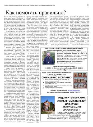 пример: они видят, что в нас про- дело все равно нужно сделать, рый опыт в духовной жизни, исходят какие-то перемены, они и я объясню, почему. Потому можно попытаться пойти путем видят, что то, чего они от нас пы- что есть другой человек, есть исправления уже в своем наметались безуспешно добиться на его нужда, есть какая-то его рении, сразу. Вот возник перед протяжении многих лет, вдруг скорбь, и ему, по большому сче- нами человек, возникла его происходит как бы само собой… ту, нет дела до того, в силу чего нужда, появилось желание поВот жил человек, дома никогда мы собираемся ему помочь. мочь, поняли мы, что на первом не убирался, посуду не мыл, проЭто наше внутреннее пере- месте здесь какое-то желание дукты не покупал, не говоря уже о живание – тщеславие, само- угождения своему тщеславию. том, чтобы что-то приготовить. И любование или что-то другое. Тщеславие в сторону, дело – невдруг он начинает все это делать. Это наши проблемы. Поэтому, обходимость, мы его делаем. Семья поражена: что с ним такого если возникает такая ситуа- Такой навык у человека в свое случилось? И появляется интерес к ция и мы со своими чувствами время, с приобретением духовтому доброму, что их близкого че- разобраться не можем, надо ного опыта вырабатывается. ловека так по-новому им открыло. отложить это разбирательИ главный вопрос, конужно обязательно А если человек по-прежнему ство, помочь человеку, а по- торый точно так же в грязную квартиру том уже каяться, что в том или себе задавать: «Кому я хочу действиями угозайдет и полы не подметет, а бу- ином поступке присутствова- своими ло тщеславие или что-то еще. дить: человеку или Богу?». дет ждать, что это сделает за него жена, он после этого может убежЕсли мы уже имеем некотоПодготовила Елена Сапаева дать ее в чем угодно, но ни в чем не убеПРИГЛАШАЕМ В ПРАВОСЛАВНУЮ ЦЕРКОВЬ СВЯТОГО САВВЫ дит кроме того, что у НА БОЖЕСТВЕННЫЕ ЛИТУРГИИ ПО СУББОТАМ В 11 УТРА него какая-то блажь Также о. Борис Кригер совершает требы – крещения, новая появилась. исповеди, причащения больных на дому и в А бывает и так, больнице, соборования, венчания, панихиды, что человек, желающий привлечь к жизотпевания, освящения домов и молебны. ни в Церкви своих АДРЕС ЦЕРКВИ: 203 River Street, Toronto, Ontario близких, действует M5A3P9 (на углу River Street и Gerrard Street East) очень грубо и авБлижайший перекресток: Dundas and Bayview торитарно, так что При церкви удобная бесплатная парковка. становится понятно, что тут не в любви ЗВОНИТЕ ПО БЕСПЛАТНОЙ ЛИНИИ: дело, а в некой требовательности: «это 1-888-533-43-23 или на мобильный телефон: 1 (289) 221-2296 мое, и все должны krigerbruce@gmail.com это мое принять». В ЦЕЛЯХ РАСПРОСТРАНЕНИЯ ПРАВОСЛАВИЯ В ТОРОНТО И это тоже никогда к хорошему не МЫ ПОДАРИМ ВАМ приводит: начинаются ссоры, раздоры, обвинения. Как РАЗНООБРАЗНУЮ ПРАВОСЛАВНУЮ ЛИТЕРАТУРУ (ИЗ правило, такие разБОЛЕЕ 3500 НАИМЕНОВАНИЙ) говоры заканчива ЗВУКОЗАПИСИ МОЛИТВ, БОГОСЛУЖЕНИЙ, АУДИОКНИГИ ются чем-то вроде: (MP3 ФАЙЛЫ НА CD / USB) «Вот вы меня не слу ОСВЯЩЕННЫЕ ИКОНЫ ЛЮБЫХ СВЯТЫХ (ПЕЧАТЬ ЦВЕТНАЯ, шаете – будете гоВ ЗАСТЕКЛЕННОЙ РАМКЕ) реть в геенне огнен ОСВЯЩЕННЫЕ НАТЕЛЬНЫЕ КРЕСТИКИ ной». Что об этом можно сказать… ПОШЛИТЕ ЗАПРОС НА АДРЕС: altaspera@gmail.com Нужно помнить, или позвоните по бесплатной линии 1-888-533-43-23 что участливость – не человекоугодие, и не способ удовлетворить тщеславие; отличить одно от другого можно прежде всего по на