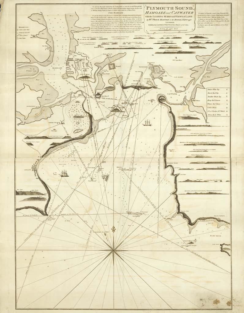 By 1800 these sheets had been discarded, and the verso printed with a chart of ‘Plymouth Sound, Hamoaze and Catwater with the Leading Marks and Views of Land by Wm. Price Master in the Royal Navy, 1798’, London, published by Laurie & Whittle, Fleet Street 12 Octr., 1800.