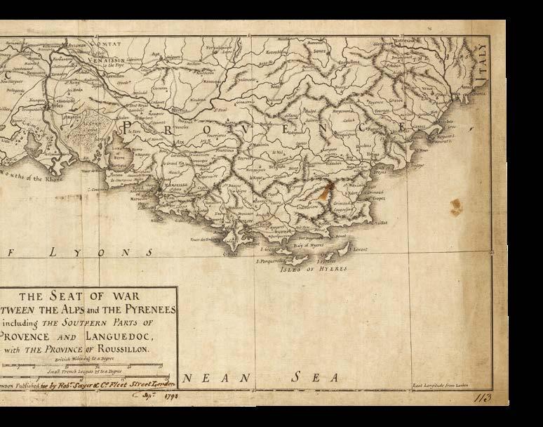 Toulon is shown on the map connected by road to other major towns, cities, and ports including Marseilles, Aix, and Grasse. This road network extends across the region, even reaching into Spanish Catalonia. Remarkably, there does not appear to be any record of a printed edition of this map, nor of a map published by Sayer under a similar title, or indeed of this region at all. It seems that for some reason, although the chart was engraved by Samuel Neele a month after this example was annotated with the date, it was never printed and sold.
