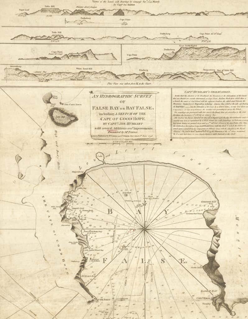 A detailed chart of False Bay, illustrated with numerous coastal profiles, and including lengthy instructions from Huddart: “Simon’s Bay is the only safe harbour in Bay False”.