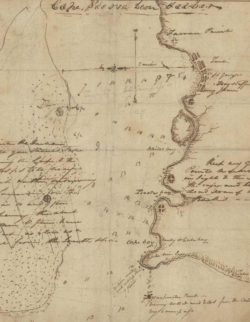 Soundings are given in Yawri Bay (“Yawry Bay”) where the Sherbro empties into the Atlantic Ocean, and along the river’s course. Obstacles such as concealed banks and islands, as well as “some places dry at low water” are identified. Some smaller rivers are represented and labelled, but few settlements appear, although on Sherbro Island “Pow Grande”, “Sarro”, “Jenkins”, “Kildare”, “Jamaica Point”, and “Cuckolds Point” are to be found. After Britain’s 1808 abolition of the international slave trade, the former Royal African Company trading post on Sherbro Island became a base for the battle against illegal slave trading.