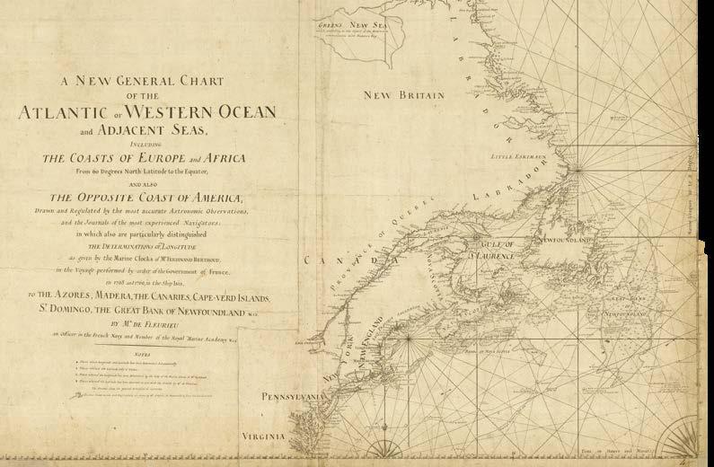 A New General Chart of the Atlantic or Western Ocean and Adjacent Seas, including the Coasts of Europe and Africa From 60 Degrees North Latitude to the Equator, and also the Opposite Coast of America, Drawn and Regulated by the most accurate Astronomic Observations, and the Journals of the most experience Navigators: in which also are particularly distinguished the Determination of Longitude as given by the Marine Clocks of M.r Ferdinand Berthoud, in the Voyage performed by order of the Government of France, in 1768 and 1769, in the Ship Isis, to the Azores, Madera, the Canaries, Cape-Verd Islands, St. Domingo, the Great Bank of Newfoundland &ca. By Mr. de Fleurieu an Officer in the French Navy and Member of the Royal *Marine Academy &ca.