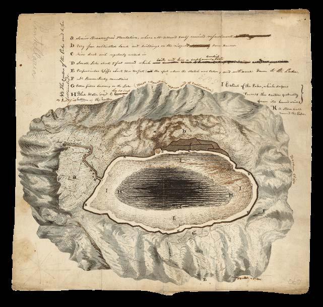 An interesting manuscript plan of Lake Pantelleria on the eponymous island. The small Italian island of Pantelleria, known in antiquity as Cossyra, is situated in the Strait of Sicily, 35 nautical miles east of the Tunisian coast. Its strategic location made it an attractive base for the British during the Napoleonic Wars, and investigations were launched into the feasibility of occupying the island, but the proposal was ultimately rejected in 1812. Five years later, according to the manuscript account written on the back of the plan, Captain John Mayne and a Mr. Holland visited the island and were hosted by one Mr. Bocanagras, who owned a plantation there. The plan shows the sites they visited, labelled with letters corresponding to a key above. These include “B. very fine cultivated land and buildings”, “E. perpendicular cliffs about 80 or 100 feet” and “G. cotton fields bordering on the lake”. This lake dominates the centre of the plan and, according to Mayne, “boils and has a sulphurous brackish taste”. Indeed, the Specchio di Venere (‘Mirror of Venus’) is a soda lake, and lies in a crater formed by previous volcanic activity on the island.