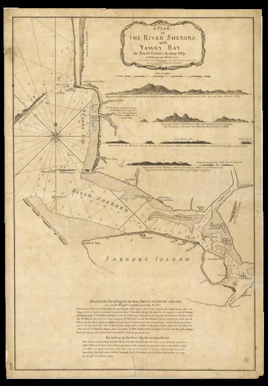 Above the island are shown four horizontal views showing how the land appears from the water. At the bottom of the chart are “directions for sailing into the River Sherbro to Jenkins where shipis of a great draught of water generally anchor”, as well as instructions “for sailing up the River Sherbro to York Island”.