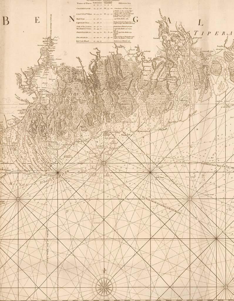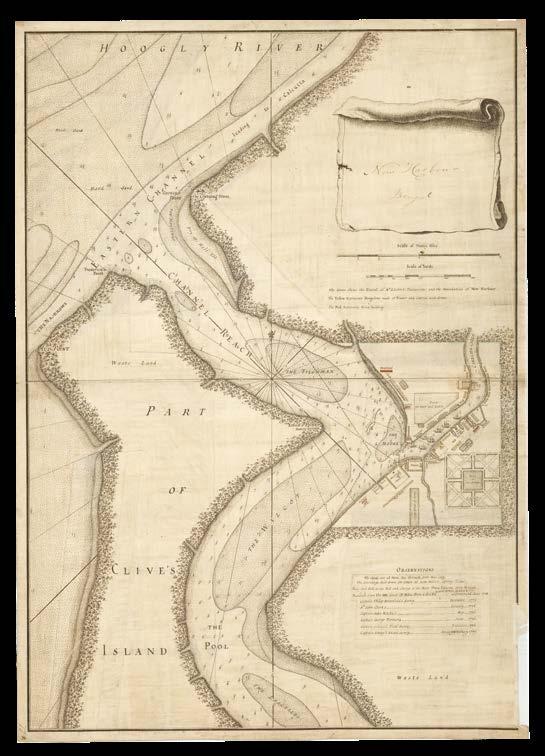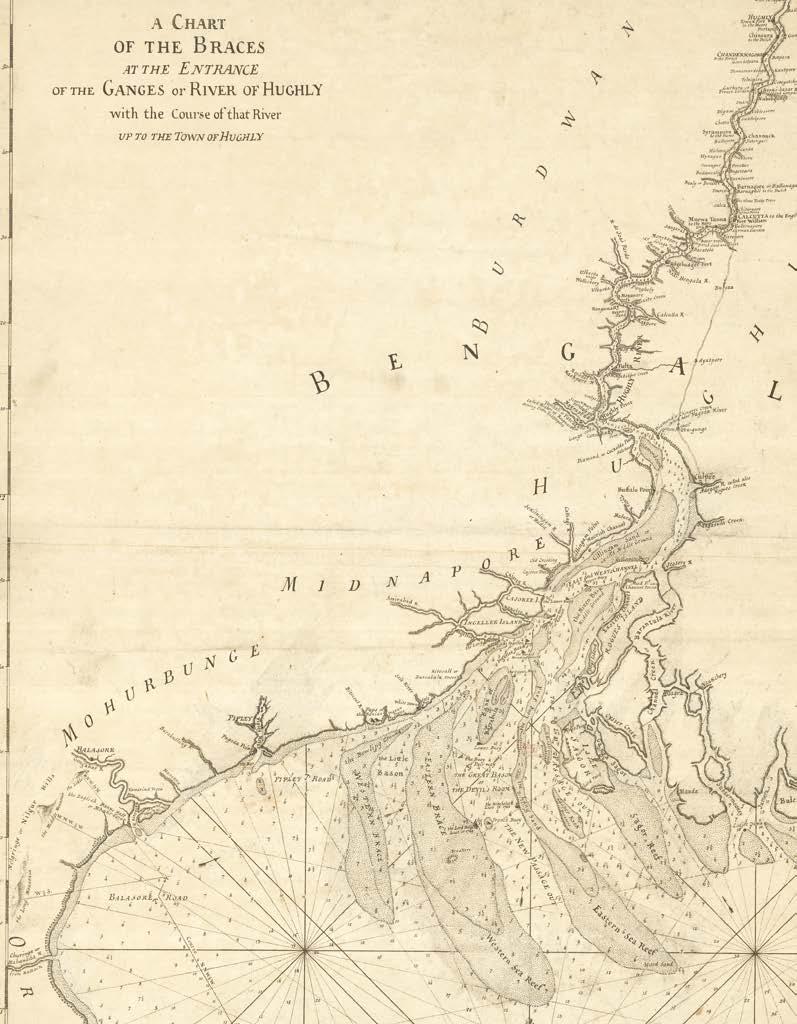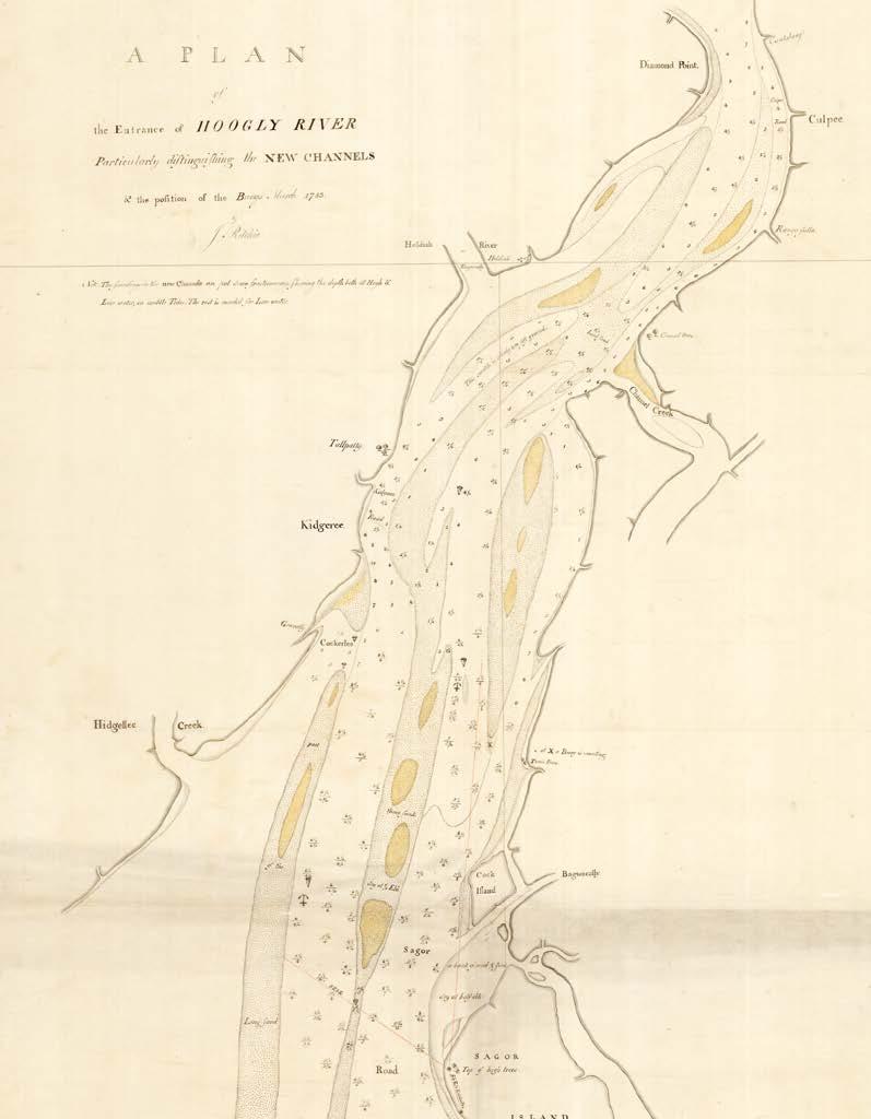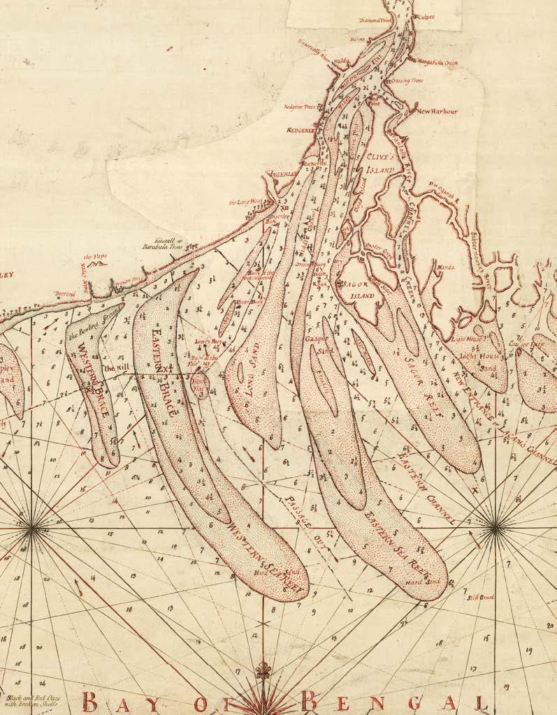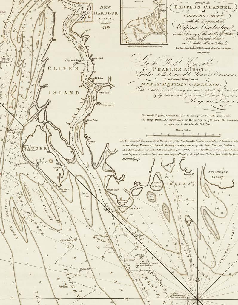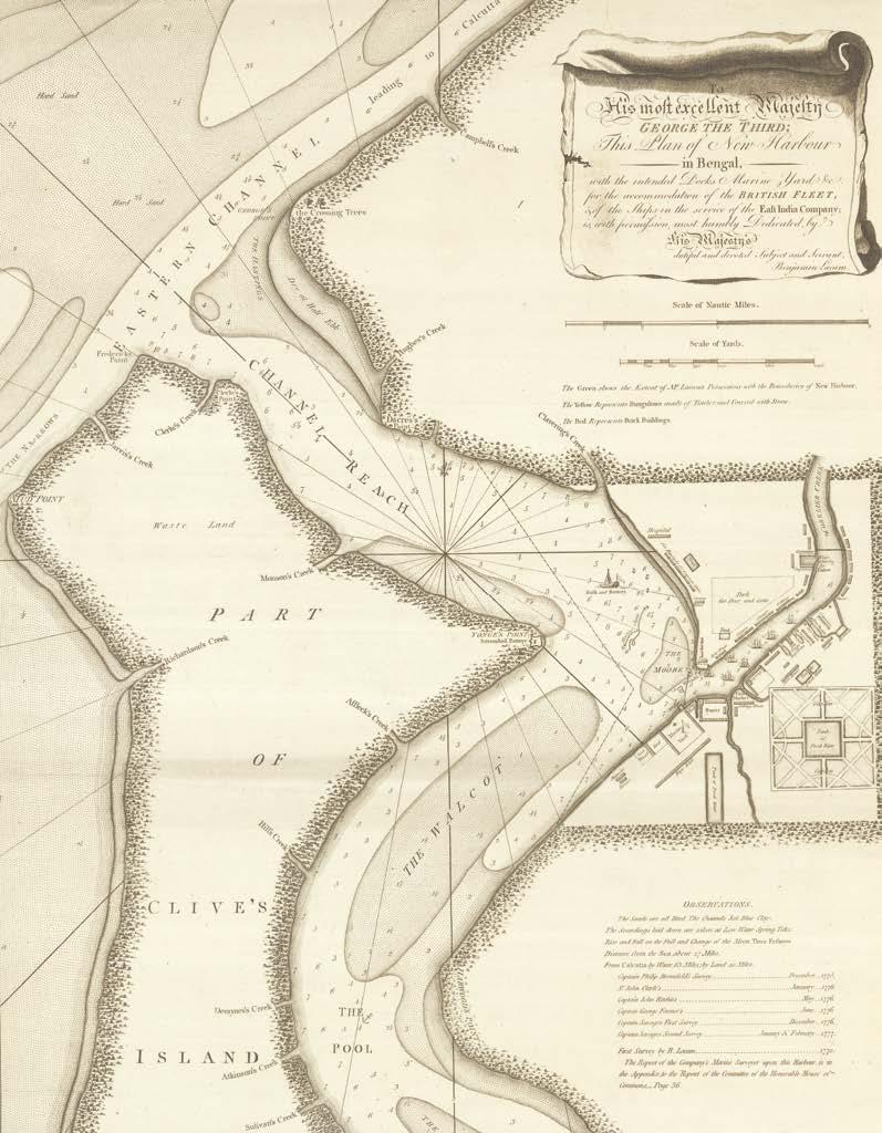Lacam, who is best-known for his protracted attempt to build and then defend a ‘New Harbour’ on the Hooghly River, shows a number of tracks across the Indian Ocean, for example: “from Madras to Mauritius during the contrary monsoon = 4020 miles”; “first track of Commodore James from Madras to Bombay in the months of September and October 1754”; “track from Bombay to Madras in the north-east monsoon - 3540 miles”; “track from Madras to Lacam’s Channel N.E. = 660 miles; to New Harbour = 710 miles”.