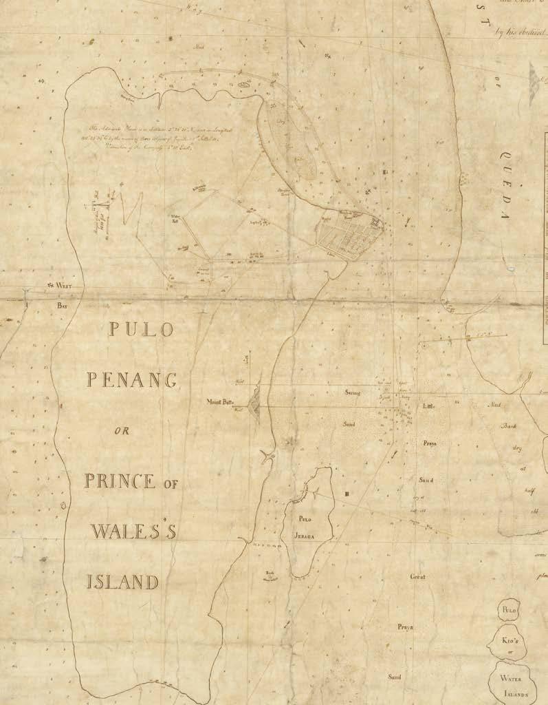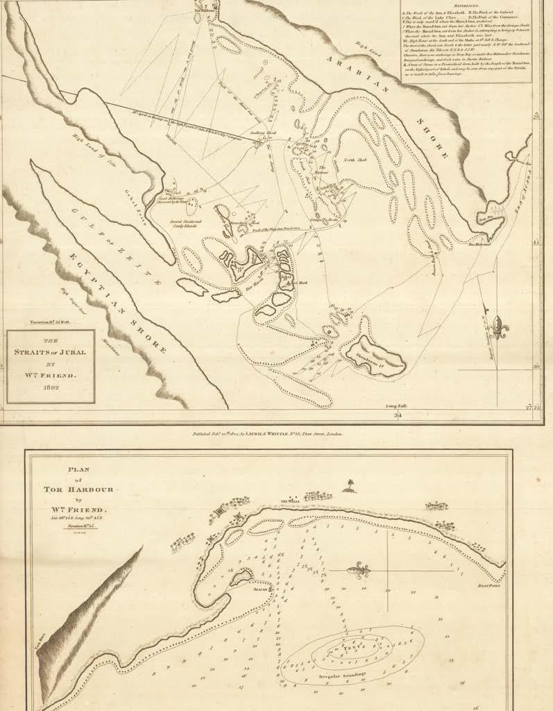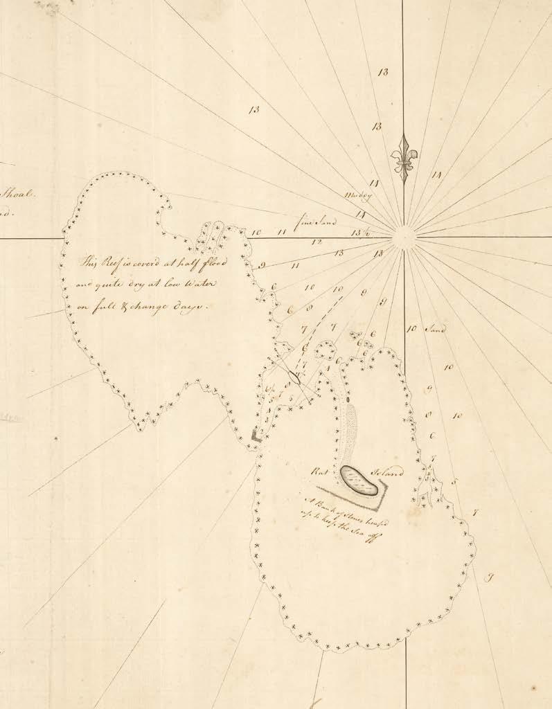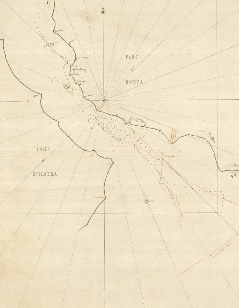 The title and dedication, to William Henry Pigou of the East India Company, have been added beneath the scale bar in red ink, and the box previously found around the views on the left removed. The longitude scale along the lower margin has not yet been added, and the chart also still awaits Huddart’s sailing directions and the publisher’s imprint. The keen-eyed editor also points out that the letter ‘R’, for the ‘Royal Admiral’, which had appeared on the version drawn by Huddart himself has been omitted.