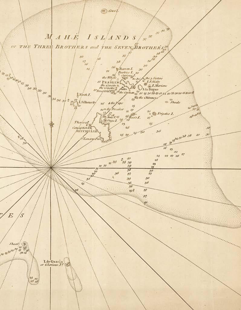 On a separate sheet three insets have been prepared. The largest shows the Comoro Islands in the north of the channel, where the French colonial authorities had established numerous sugar plantations. The bay on the north side of the island of “Johanna”, now Ndzuwani, is shown in an additional inset, with soundings provided in the waters off “Governor’s Town”. Finally, the third inset shows ‘Foul Point and Bay on the east side of Madagascar’, where British ships had stopped before their victory over the French at the siege of Pondicherry in 1760.