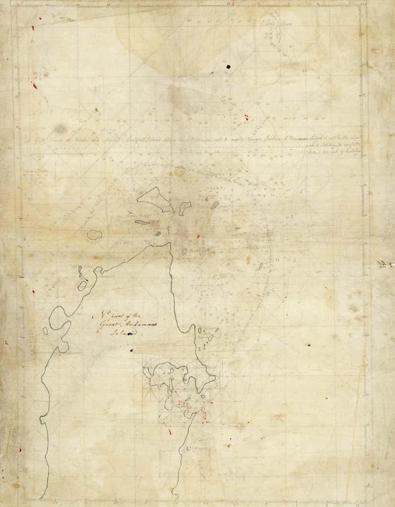 In this working manuscript, designed to establish the general scale and shape of the new chart, the mapmakers have patched whole continents together as insets to surround the central Indian Ocean. A large vignette map of “Bombay Harbour” appears in Northern Africa, which in the printed map was replaced with the title and dedicatory cartouche, and a smaller inset of the “Bay of Johanna”. While there are rhumb lines, and placenames, there are no sailing directions.