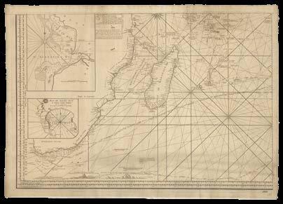 While no changes have been made to the African coast, the west coast of Madagascar has been heavily revised, with more soundings added, the mouths of rivers drawn with greater precision and many of the shoals and sandbanks omitted. In the “Gulf of Madagascar”, where previously the “Bassas de India” were presented, there are now the “Europa Rocks, discovered in 1774, often mistaken for the Bassas”. The “track of the Speaker, Capt. Rob.t Scott in 1772” have also been added. Moreover, the three insets that earlier appeared on a separate sheet have been included in the upper left-hand corner of the chart.