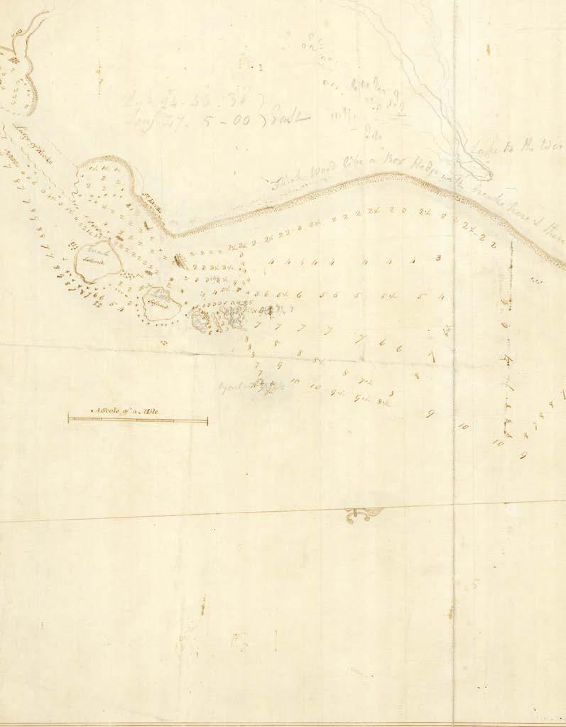 Young’s map shows “St. Lucie” where the crew settled during their five-month wait for rescue, and describes the “lake to the westward of the town”, and a “thick wood like a box hedge with breaks here and there that the inhabitants come through”. The river, he states, offers suitable passage only for canoes. He also makes a remark that “about 6 leagues to the northward of Bird Island lies a very dangerous reef”. While there are no longitude or latitude scales, Young has written out the coordinates of “Little Island”, and provides a mile scale and compass lines.
