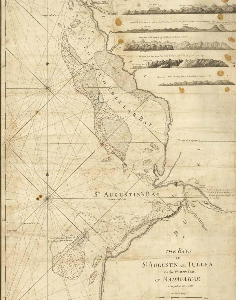 The two principle harbours in this region are provided by “St. Augustin’s Bay” and “Tullea or Tollear Bay”, today Toliara. They are located either side of the mouth of the Onilahy River (“Dartmouth River called by the natives Onglahe R.”). Soundings, sand banks, reefs, anchorages, and “foul ground” are identified in the coastal waters, according to surveys conducted in the 1750s. The former survey was likely carried out when the ‘Stretham’, ‘Pelham’, ‘Edgecote’, and ‘Houghton’ East Indiamen docked at St. Augustin in 1755, and the latter by William Nichelson, the master of HMS ‘Elizabeth’, who landed in the bay three years later. Five coastal views in the upper right-hand corner show sailors how the land would appear to them from the sea.