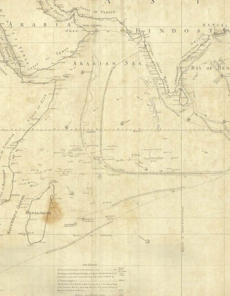 The extensive chart spans the Indian Ocean from the Cape of Good Hope to the island of Sumatra with tracks comparing the different routes taken during the monsoons. In winter, the ocean current flows westwards from the Indonesian Archipelago across to the Arabian Sea, whereas in the summer, it flows eastward from Africa into the Bay of Bengal. Consequently, mariners were advised to alter their routes depending on the time of year.