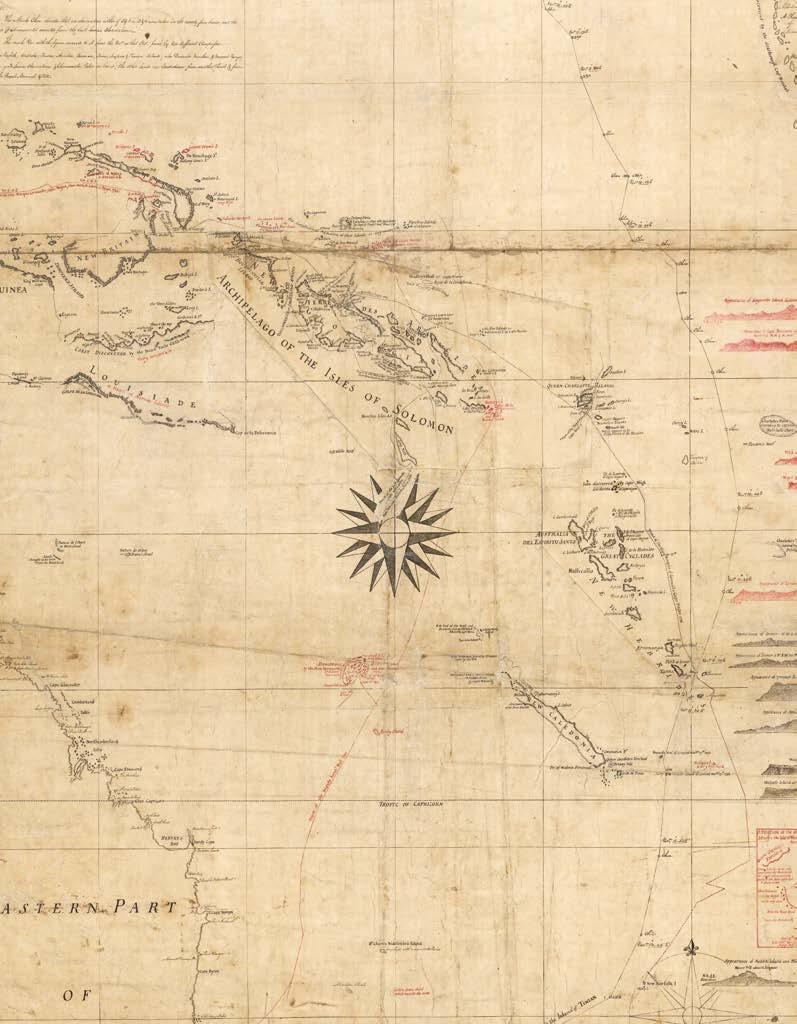 The present chart covers the stretch of water between Norfolk Island in the south and ‘Terra des Arsacides’ (Land of the Assassins), modern-day Malaita, an island in the Solomon Islands archipelago, in the north. The track of the Indiaman passes the New Hebrides, as well as Queen Charlotte Islands, now called the Santa Cruz Islands. Coastal profiles of these latter islands are given on the left-hand side of the chart (see item 218).