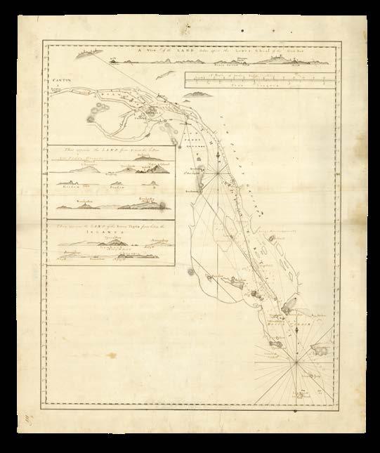 Along the upper edge of the map is “a view of the land taken upon the lower shoal of the first bar”; on the left-hand side, in two boxes, there are additional views showing numerous other parts of the land. These views are labelled with letters, corresponding to those found on the main chart.