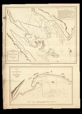 The 1808 printed edition of Benjamin Lacam’s comparative chart of routes through the Indian Ocean (item 117), first published in 1794. New tracks have been added “from Bombay to Madras as in the North East Monsoon” and “from Madras to Bengal in the N.E. Monsoon”, as well as a note warning that “the change of the monsoon in the East Indies, from south west to north east is generally attended with the most tempestuous weather”. There is an inset containing ‘a supplemental sketch exhibiting the sea engagements in the Bay of Bengal between the English and the French fleets from 1758 to 1783’, which is also found on the 1794 edition but not the original manuscript. A nine-point list describes various skirmishes between the rival fleets, their location symbolized on the chart by a small sword.
