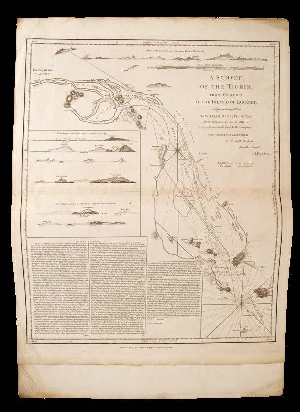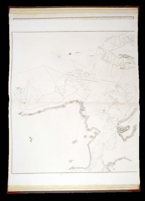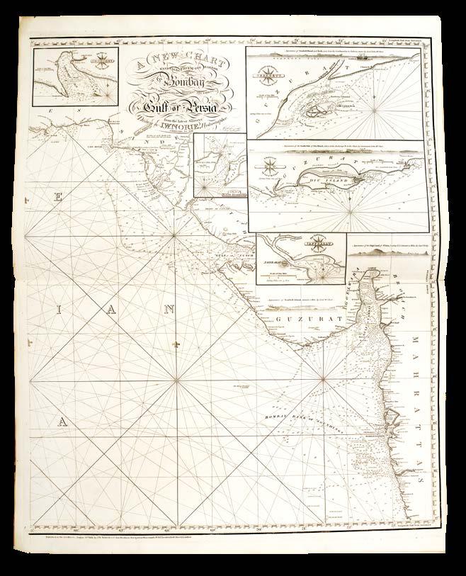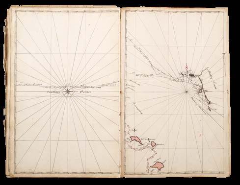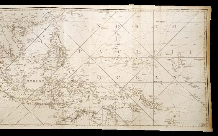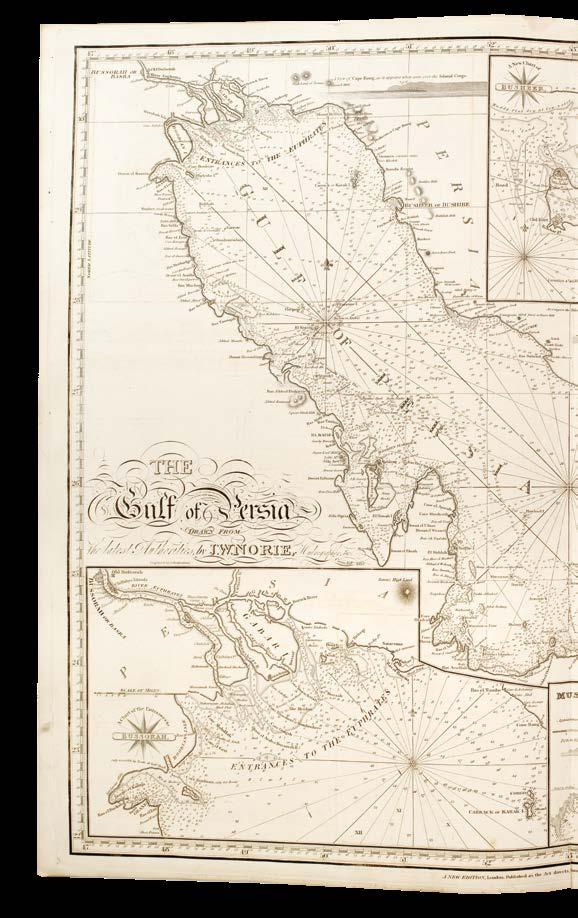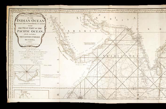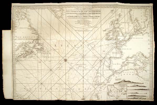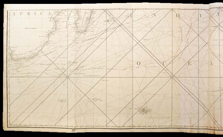 The present work is intriguing, as the double-page charts are mounted on stubs that are themselves made from old versions of Dunn’s charts. It is also extremely rare: no copies can be traced at auction (RBH); the only institutional copies that can be traced are those in the London Library, Danish Royal Library, and the Huntington Library. The London Library’s example is bound with the same author’s 24-pages, small quarto accompanying text, ‘The navigator’s guide to the Oriental or India seas, or, The description and use of a variation chart of the magnetic needle’, dated 1775.