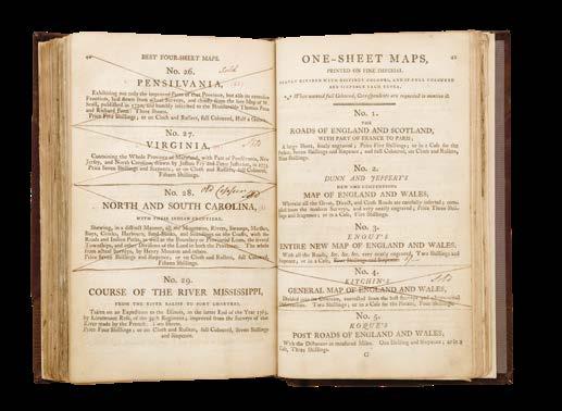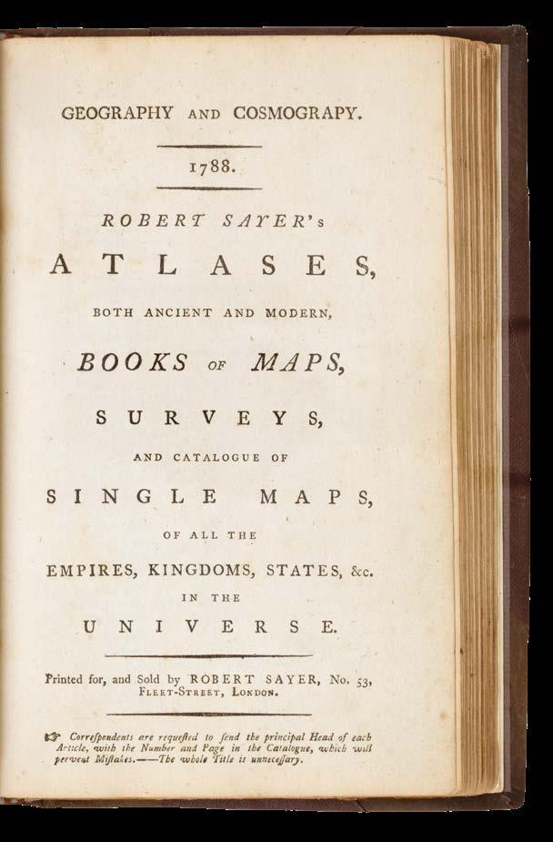 The engraved trade of map and chart seller James Heskett on the front pastedown is interesting as it shows that Sayer was selling not only directly, but also through other dealers. Heskett of 13 Sweetings Alley, Royal Exchange, describes himself as: “Map, Print & Chart-Seller. Prints & Drawings neatly Framed & Glazed. Maps Beautifully Colourd [sic] and adapted for Librarys [sic] or Travelling. Globes & Mathematical Instruments, Books, Gunters-scales, Compasses, Pencils and India Ink. Charts properly fited [sic] up for Navigation. Drawing Books, & Reeve’s Superfine Colours. Atlases, East & West India Pilots.”