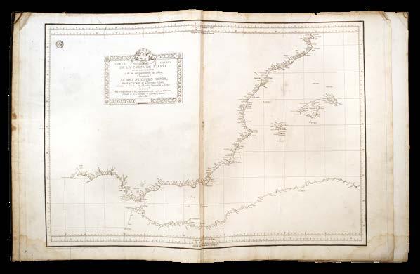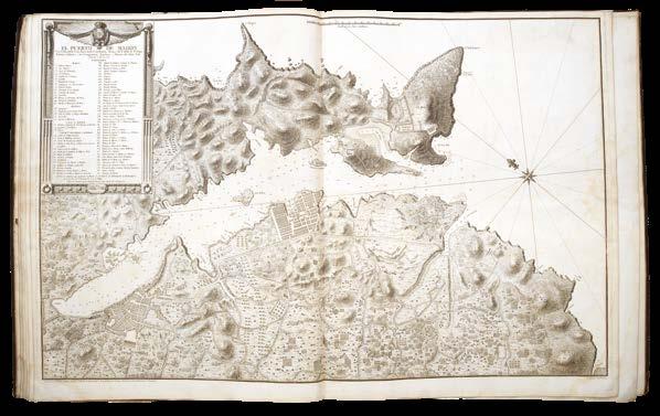 Two volumes. Large folio (625 by 485mm). Volume one: engraved title, 30 doublepage charts, plans, and coastal profiles, of which 22 are double-page, six charts with pencil grid annotations and ink marks, including two in English, chart five with tiny hole in a blank area; volume two: 11 charts and four coastal profiles, all double-page; some light creasing, staining, and soiling; contemporary Spanish sheep, not quite uniform, covers tooled with an identical border composed of a foliate scroll intertwined with a dotted roll, volume one bound in tree sheep with border enclosing single gilt fillet, volume two bound in mottled calf with the border enclosed by double-gilt fillet, accompanied by a pair of bust-length portraits (both 494 by 414mm), oil on canvas, on modern stretchers and framed to style, these originally hidden between the pastedowns and the boards.