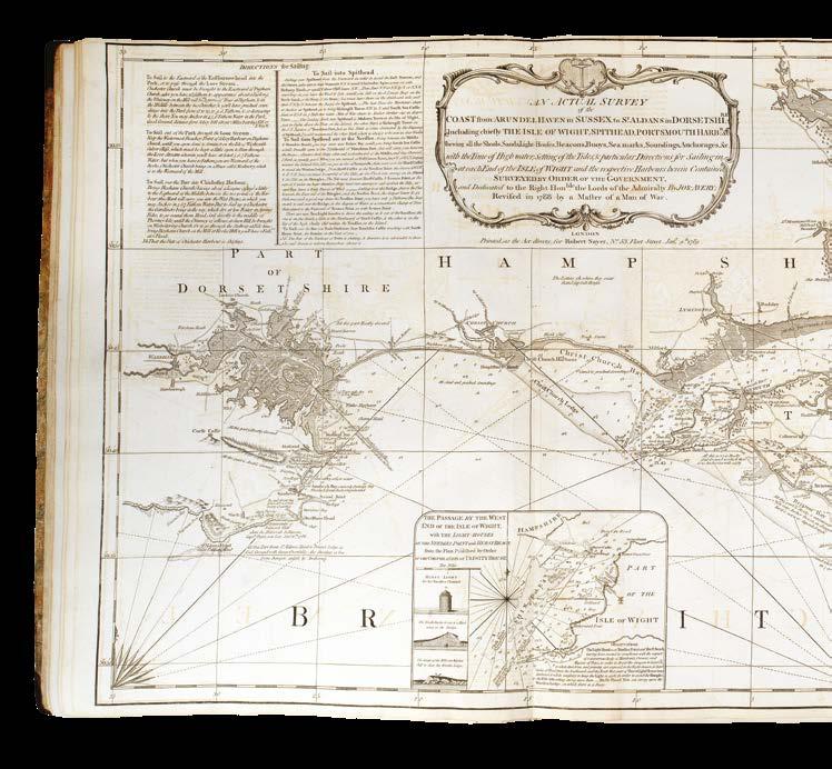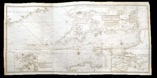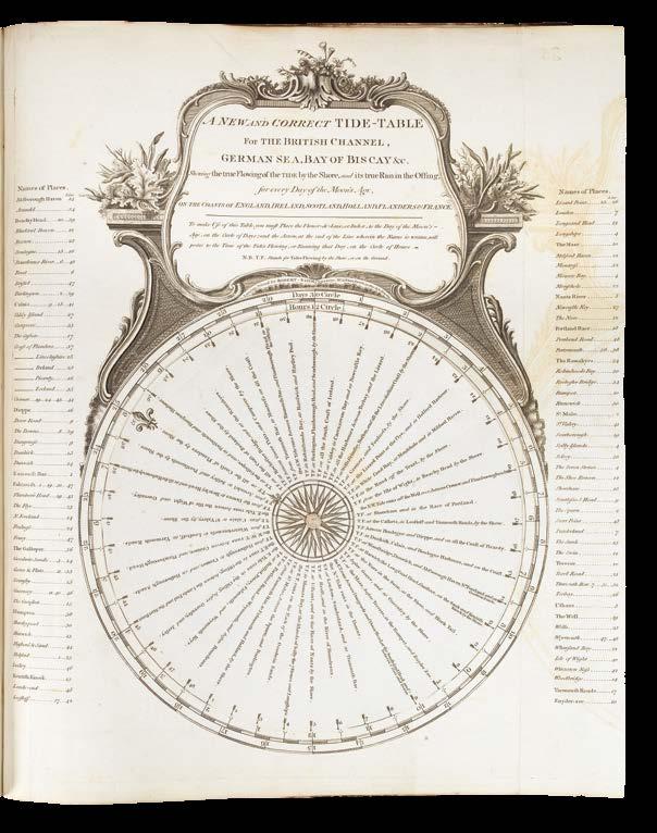 Large folio (540 by 385mm). 24 engraved charts and one tide table, all numbered in ink stencil, four of which folding, 18 double-page, and two single-page, the final engraving being “A new and correct tidetable for the British Channel” printed on a single sheet with right-hand margin folded complete with one moving dial, some light offsetting throughout; contemporary half calf over marbled-paper covered boards, rebacked and recornered to style.