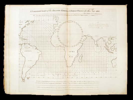 Dunn’s atlas provided sailors with crucial information about magnetic variations across vast ocean regions, which was essential for accurate navigation. This was particularly valuable at a time when determining longitude at sea was still a major challenge. The atlas was based on Dunn’s own theory of the magnetic system, demonstrating his attempt to understand and systematize the complex behaviour of the Earth’s magnetic field. Dunn endeavoured to bridge the gap between theoretical understanding and practical use, and to make his work directly relevant to mariners. The atlas itself has comprehensive geographical coverage of the [North] Atlantic, Ethiopic [i.e. South Atlantic], Southern, and Indian Oceans. In recognition for his work, Dunn was engaged by the East India Company as an examiner in mathematics for their cadets.