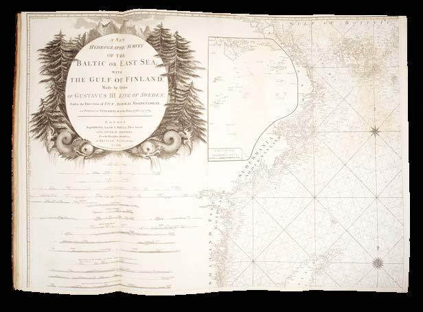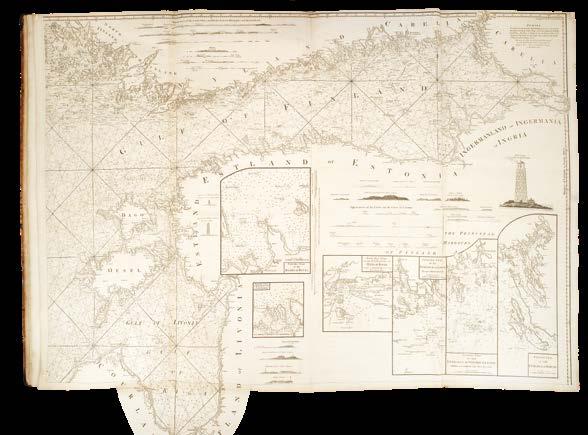 Large folio (640 by 495mm). Eleven folding and eight double-page engraved charts, two with engraved lines indicating sailing channels highlighted by hand in red ink, without three charts and additional unnumbered chart of the British Isles (called for in contemporary ink manuscript) listed on title, chart 5 with very small loss along creasefold; chart 7 with long tear into sea area but without loss, chart 10 with light fraying and browning to western edge with tiny loss to border; contemporary half-calf over marbled paper-covered boards, red morocco gilt lettering piece to upper cover.