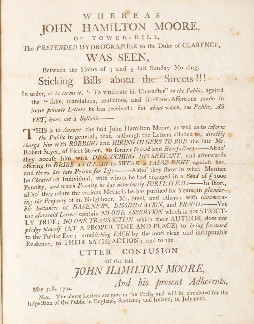 Despite all these knocks, or maybe because of them, Moore was prone to self-aggrandizement. In the 1790s, Moore began advertising himself as “Hydrographer and Chartmaker to his Royal Highness the Duke of Clarence”, which led to his detractors publishing a broadside declaring Moore a “Pretender”. Moore had dropped this particular claim from his charts by 1804.