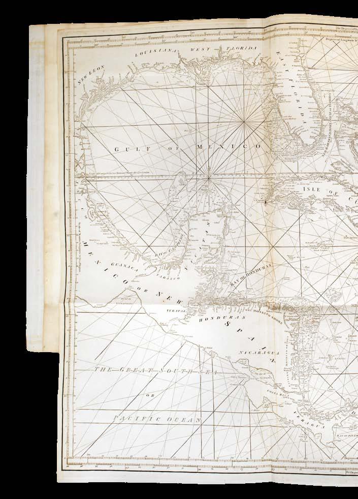 These three charts contain the earliest imprint of Laurie and Whittle, 12 May 1794, probably the day they became the new proprietors of Robert Sayer’s business (see Fisher, p.61). All three were published earlier as part of Thomas Jeffreys’ The Atlantic Pilot by Laurie and Whittle in 1794 (see Christie’s New York, sale 8536, 8 November 1996, lot 81), but they are in fact much older in origin. The first chart, “An Accurate Draught of the Gulph-Passage from Jamaica with the West end of Cuba, & c.” has a note on the Florida peninsula that reads “Published by the Author May 20 1761”. Sayer’s practice of creating charts “done up in a portable manner” (quoted by Fisher, p.57) but without text, was therefore adopted by his successors, ostensibly offering a different, more specialized product. While extremely flexible, and a profitable way to publish, it did lead to charges that these charts were out of date and unreliable in area where accuracy was of prime importance. In fact, these charts were already obsolete by the time of publication, as newer hydrographic data emerged from the Napoleonic Wars.