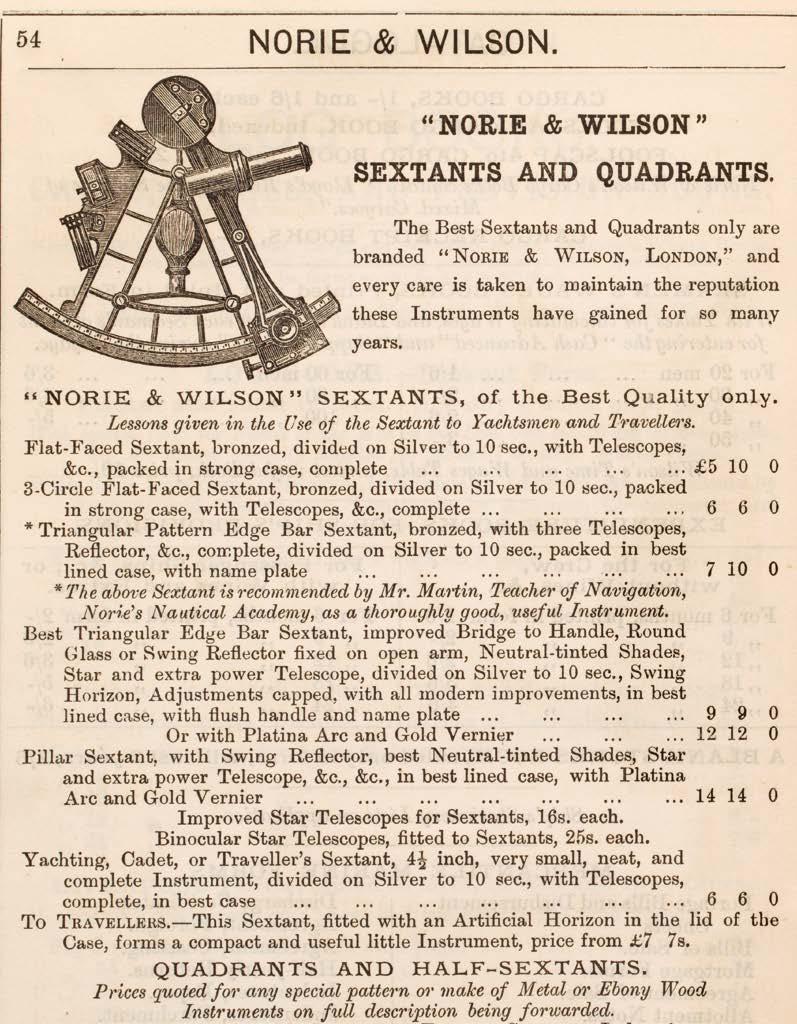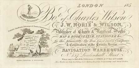 Charles Wilson used J.W. Norie & Co.’s offices at 157 Leadenhall Street as he might his club, and the shop was actually run, as it always had been, by Jeffrey Dennis until 1849, and then by John William Appleton. Dennis and the shop are described in great, and loving, detail by Charles Dickens in his ‘Dombey and Son’ (1844): “The stock-in-trade of this old gentleman comprised chronometers, barometers’ telescopes, compasses, charts, maps, sextants, quadrants, and specimens of every kind of instrument prosecuting of a ship’s discoveries. Objects in brass and glass were in his drawers and on his shelves, which none but the initiated could have found the top of, or guessed the use of, or having once examined, could have ever got back again into their mahogany nests without assistance. Everything was jammed into the tightest cases, fitted into the narrowest corners, fenced up behind the most impertinent cushions, and screwed into the acutest angles, to prevent its philosophical composure from being disturbed by the rolling of the sea... the shop itself, partaking of the general infection, seemed almost to become a snug, sea-going, ship-shape concern, wanting only good searoom, in the event of an unexpected launch, to work its way securely to any desert island in the world”.