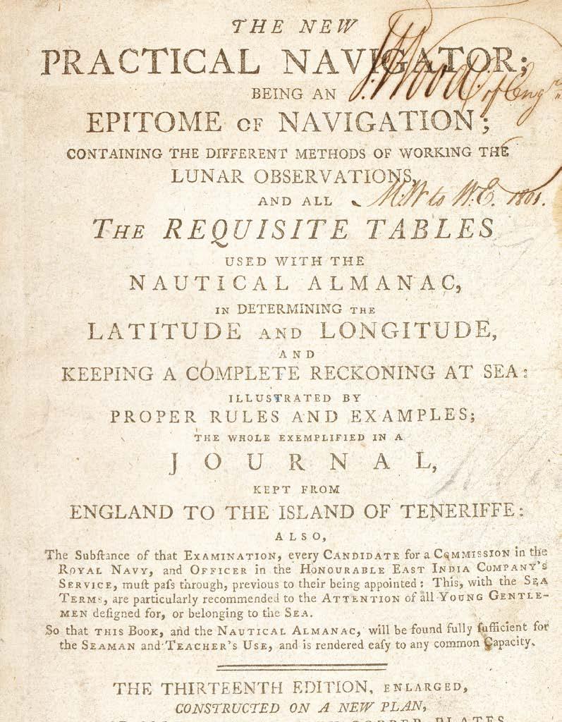 Following a successful career in the Royal Navy, Moore founded a navigational academy near London, and published the fundamental tool for practicing (and student) navigators, ‘The New Practical Navigator and Daily Assistant’ (1772). The work remained legitimately in print until 1828, more than 20 years after Moore’s death, but its fame rests on the fact that it was pirated, verbatim, by Edmund Blunt and Nathaniel Bowditch in America from 1799... who, in a great coup, then sold these coals back to Newcastle, when the third edition was published in London in 1803.