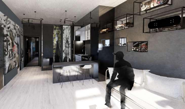 The 90 square meter apartment was part of a group assignment with Bjona Barra and Lucia Alonso, with the objective to design an apartment for our imaginary clients based on their hobbies and lifestyle The clients chosen were a Skateboarder from Berlin and a Graphite designer from Barcelona. The couple had a fast lifestyle, had a big skateboard collection and wanted to showcase street art on their walls The apartment is organized into four areas with a industrial concrete design. The kitchen and living room are design with a open room concept showcasing a full wall art piece on the side and the skateboard collection in metallic cub structure to highlight their importance. The bedroom is organized with a walk in closet in the back of the room and king size bed with a poster on top On the apartment we saw it necessary for the couple to have an office to work on their projects. The bathroom it's inspire from the bathroom is Berlin Being low light and covered on posters