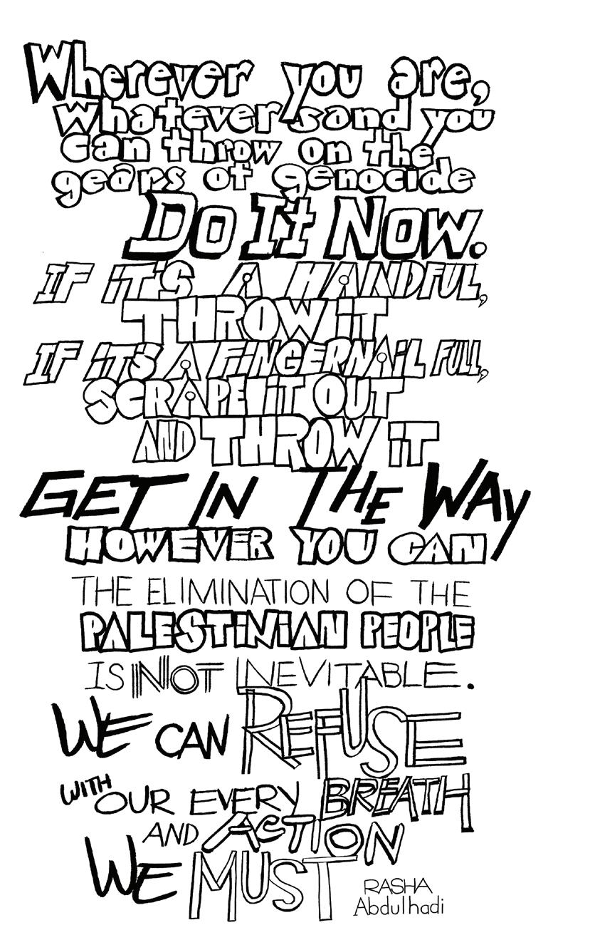 Rasha Abdulhadi calls on you to renew your commitment to resisting genocide everywhere. May your commitment to Palestinian liberation deepen your commitment to your own. May your exhaustion deepen and make you immovable. May we all be drawn irresistibly closer to refusals as spectacular as the violence waged against us. twitter: @rashaabdulhadi